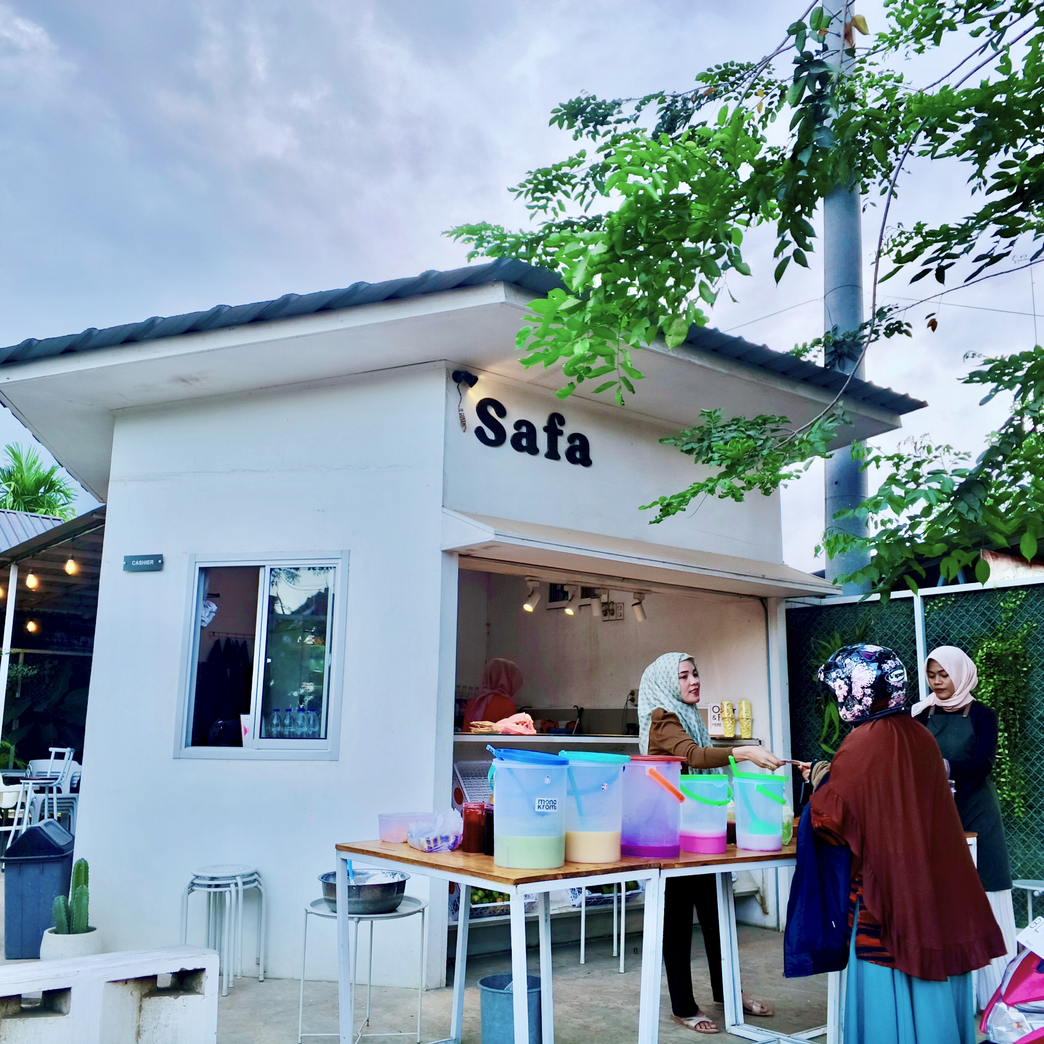 Terlihat dari depan sangat bagus dan sangat cantik, aku datang ke tempat ini bersama dengan suami, karena bulan puasa aku ingin membeli air disini, dari depan ada dua tempat, tempat pertama ada pintu gerbang yang terbuat dari daun-daun yang sudah kering menambah kesan seperti kampung halaman, yang begitu bagus, lampu-lampu yang terbuat dari rotan menambahkan kesan di pedesaan yang begitu unik, dan kursi yang berwarna putih menambah kesan mewah.