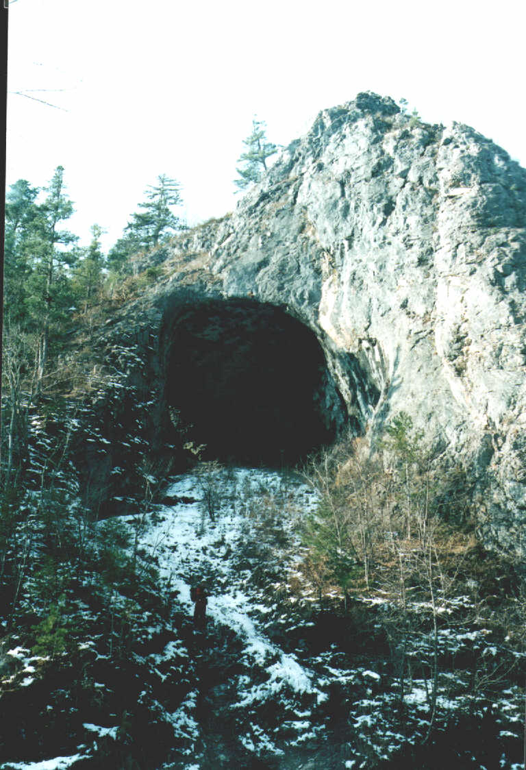 The size of the entrance is impressive right away. Ascent to the cave - icy rash. Eugene rises first and hangs the rope: on the rise and just above the cave, on the rock - to train and examine the cavity from above. A large stone bridge hangs over the cave, forming two entrances: the Big one is the central one, from the river and Slightly less is the side one, on the left