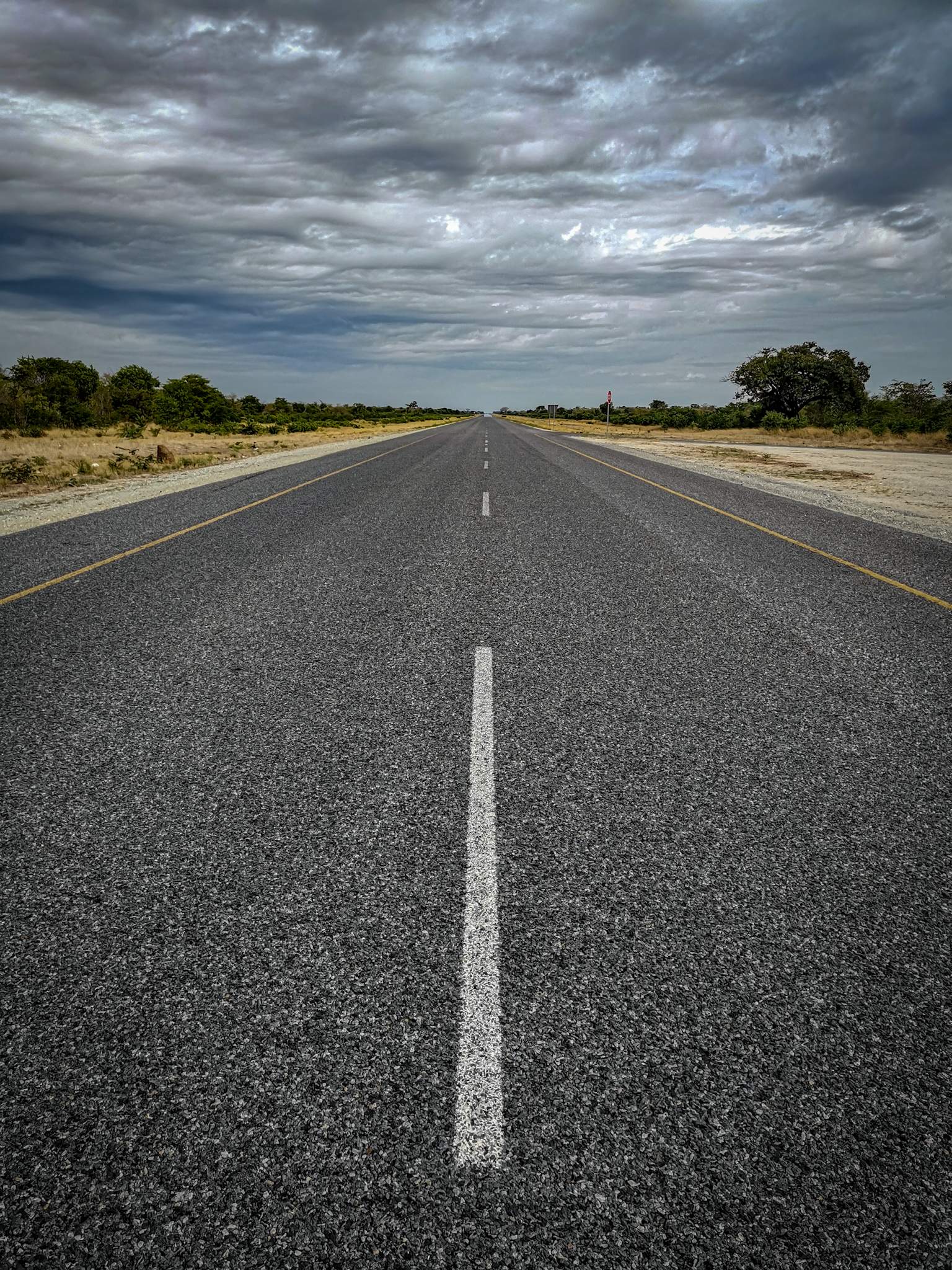 The long straight road from Botswana to Namibia in Africa, on our overland safari