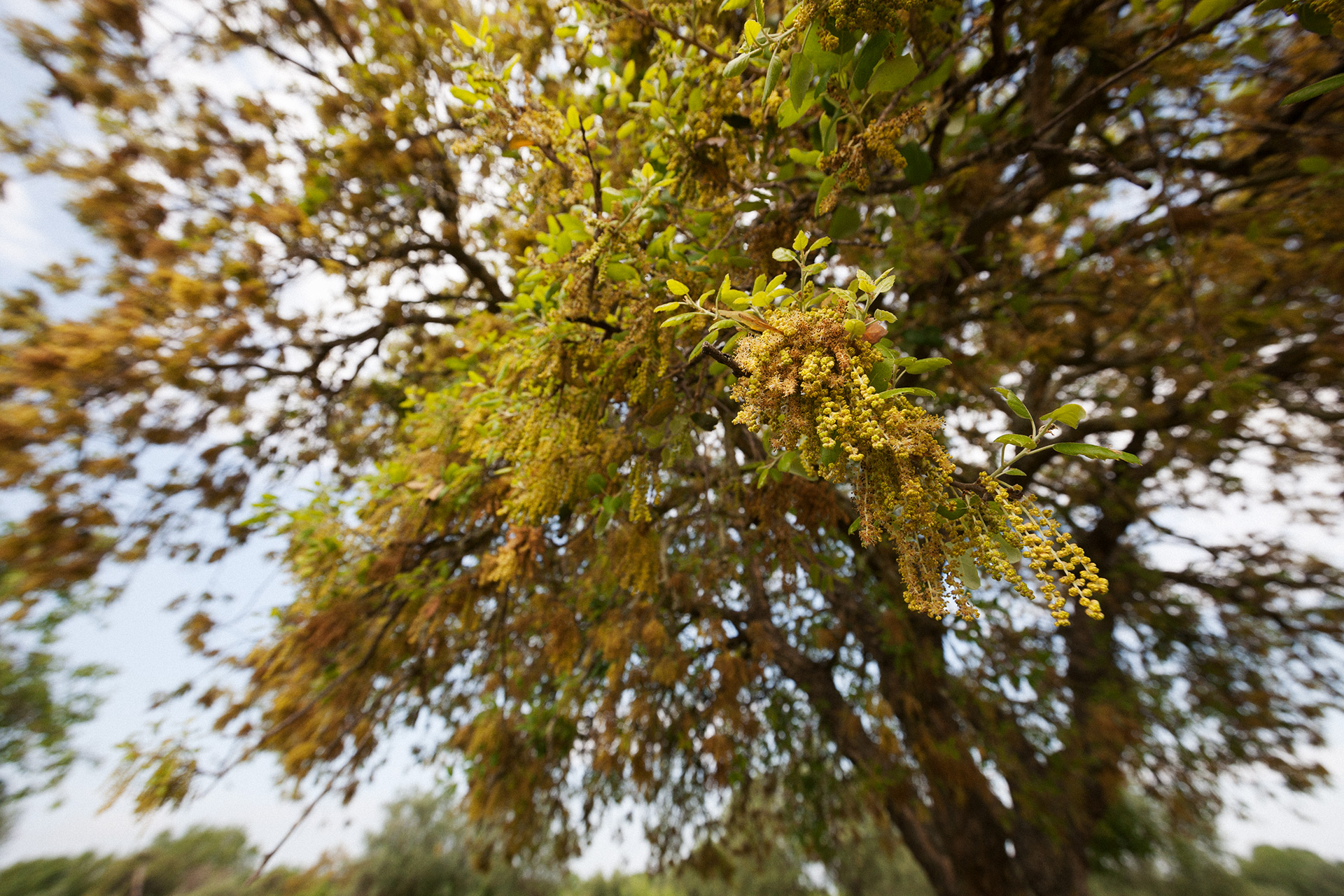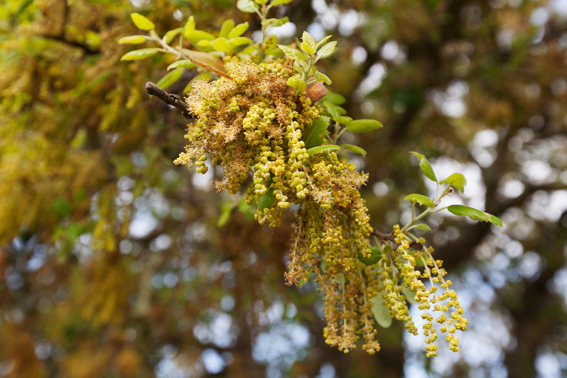 This is a young cork tree. Can you see how fluffy? It's flowering season. The video below shows how pollen clouds form as you shake it a little.