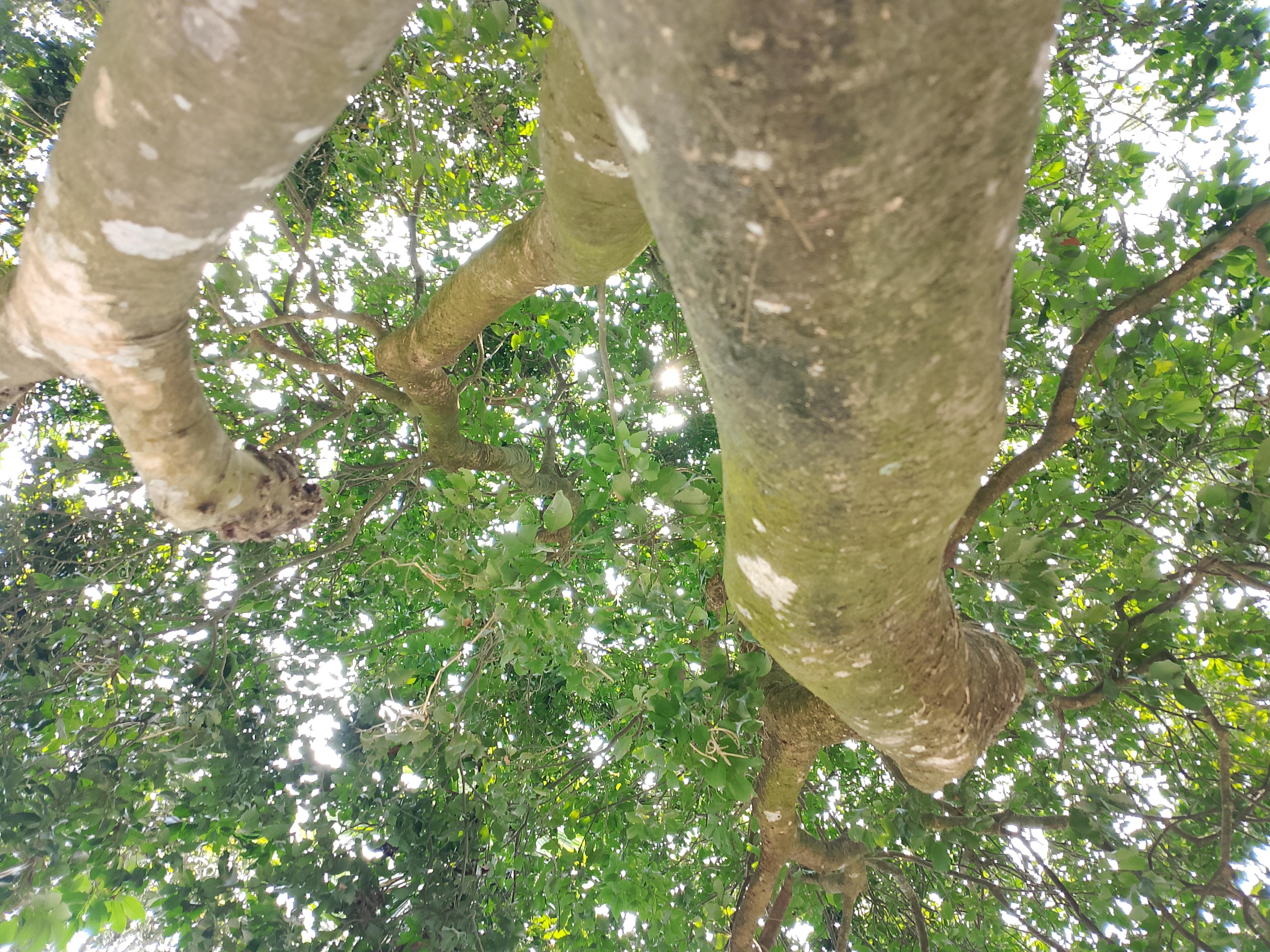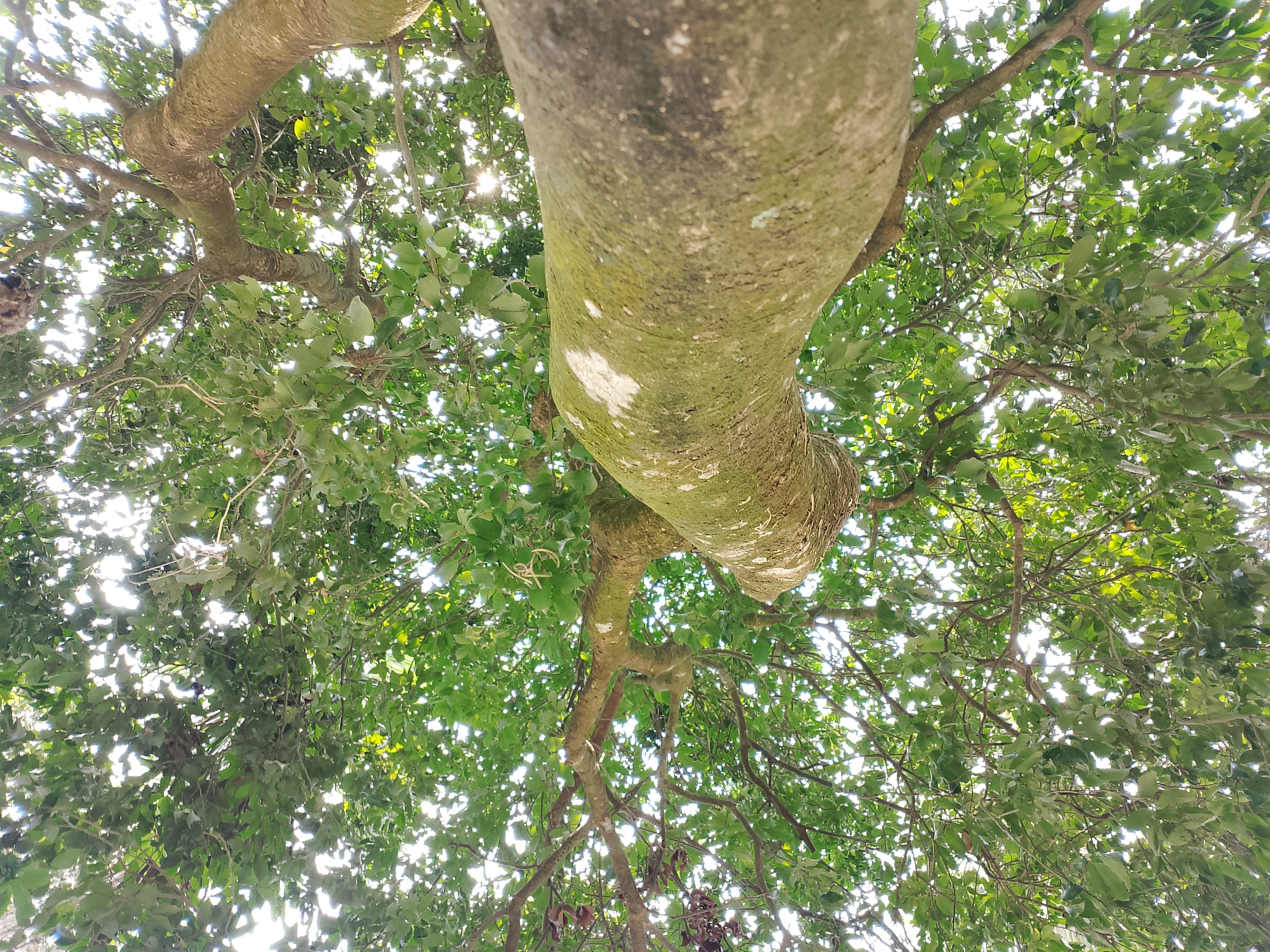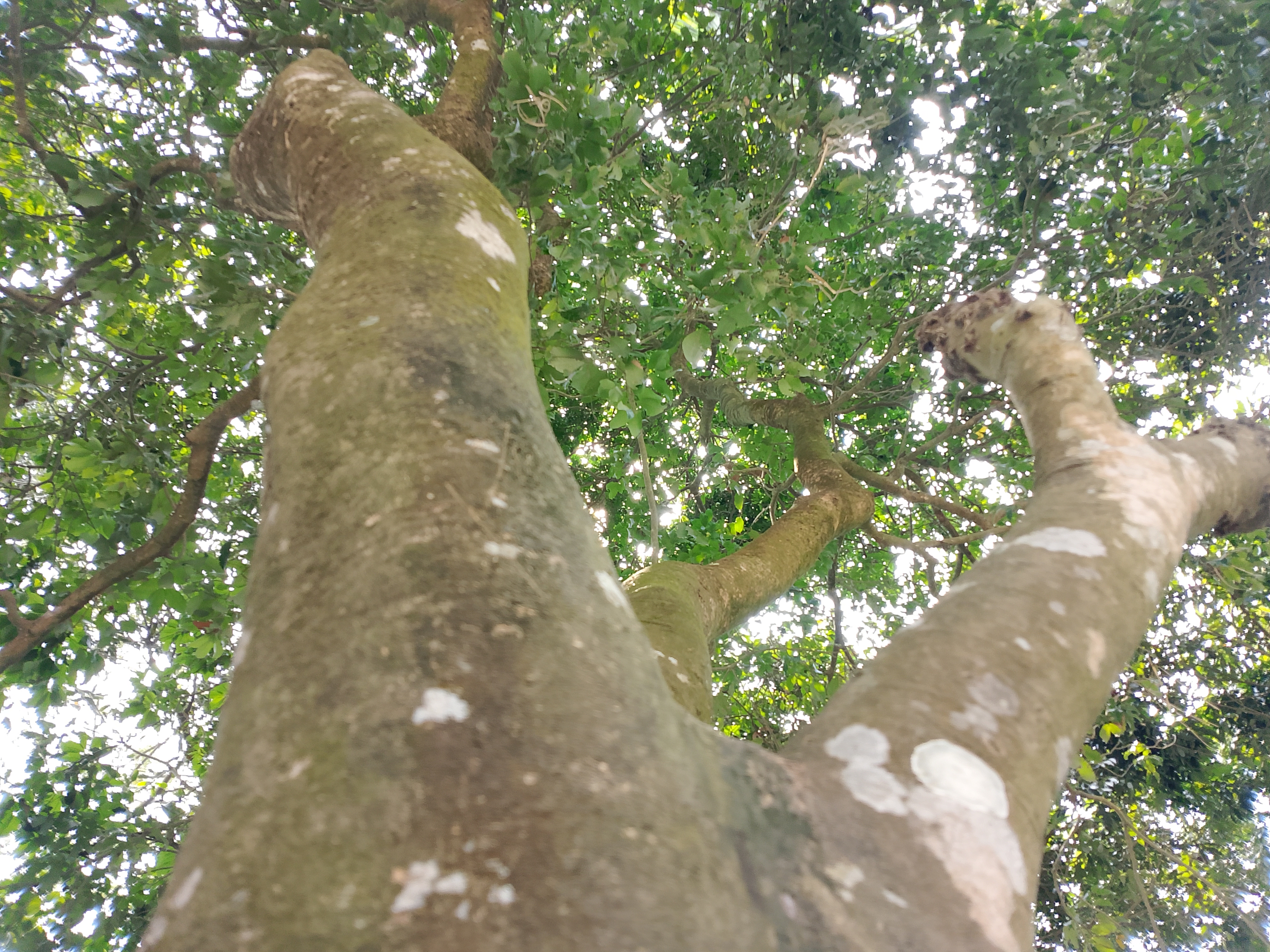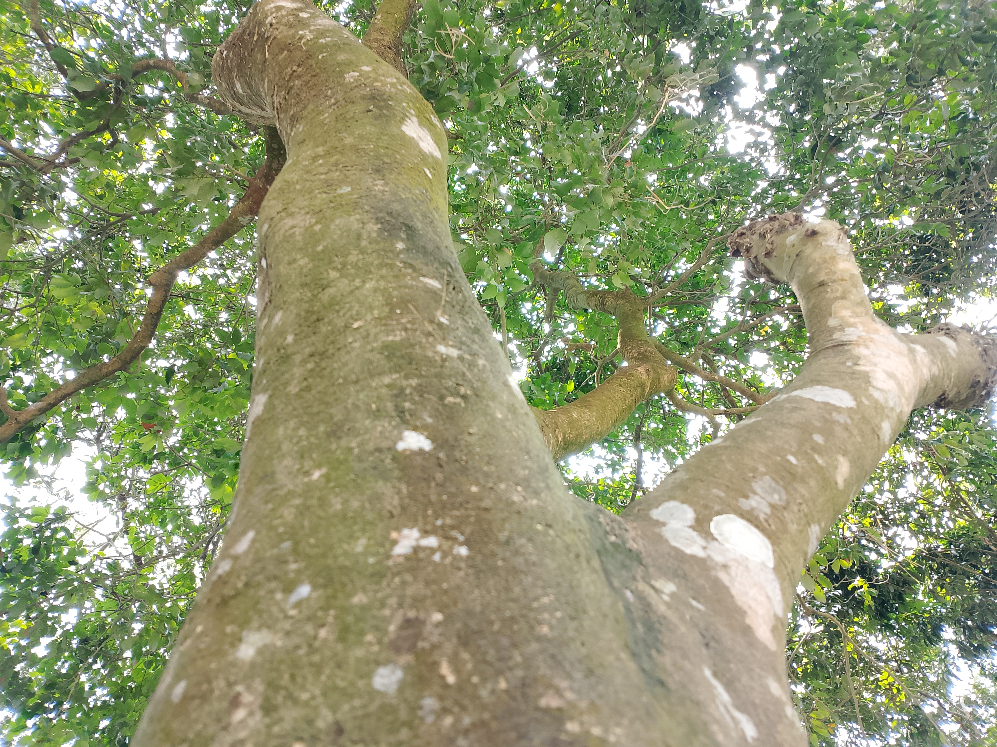 There is a large lychee tree here. The tree has many big branches, and the leaves are spread all around. The leaves of this tree are quite large, and there are many leaves on it. It can be seen that many branches have grown upward together.