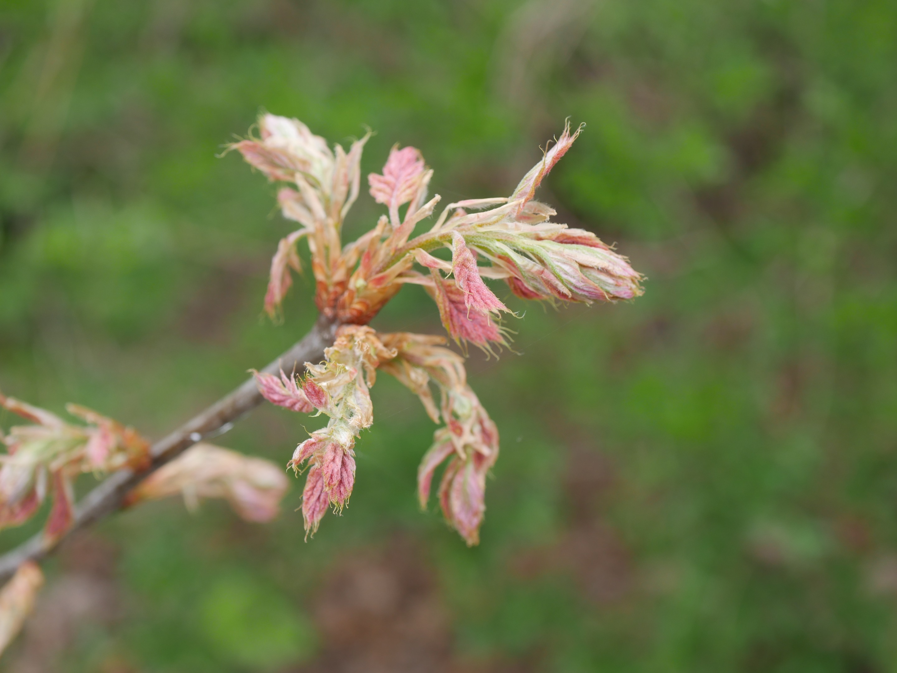 These are the start of leaves forming on the oak (first pic) that is several years old now and started from an acorn that blew over from my neighbors tree. It was quite windy and that never goes well with macro shots. However, I kind of liked the effect on this one.