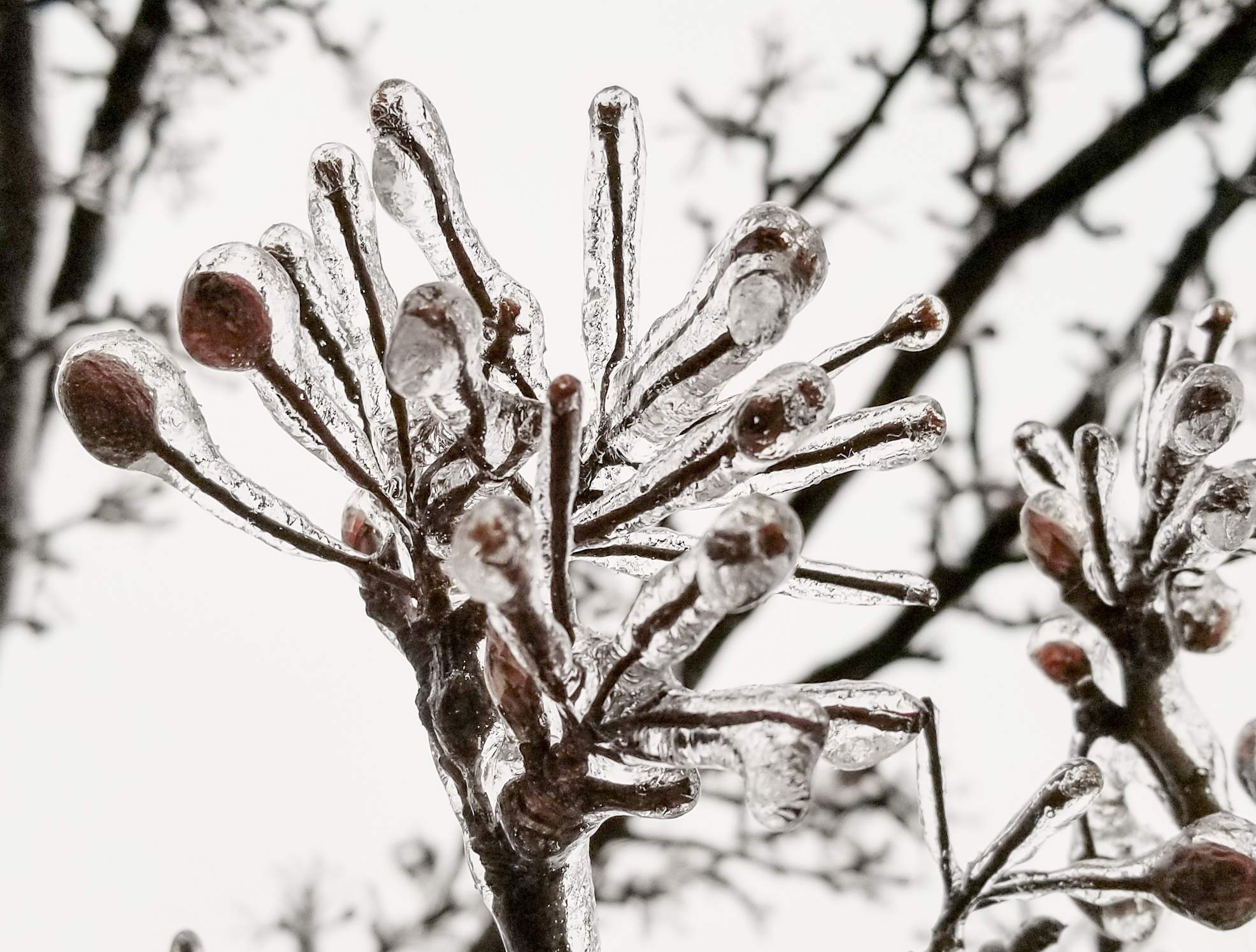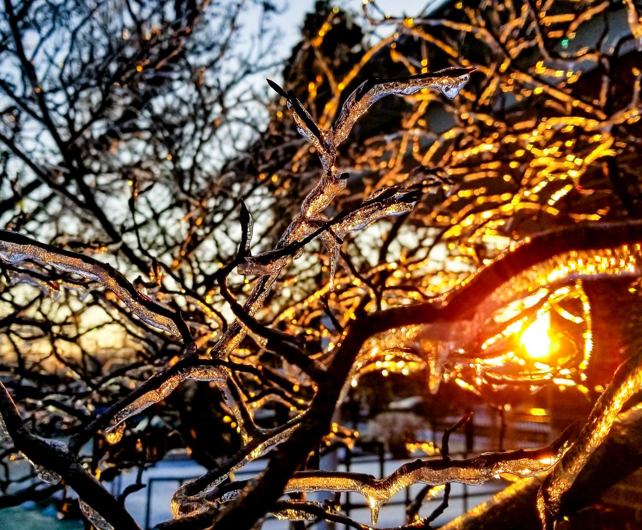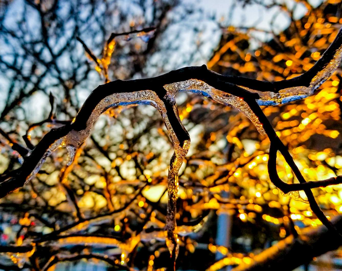 Sometimes before it snows it is still warm enough for rain but then suddenly it gets cold and the rain freezes a clear coating of ice onto branches.