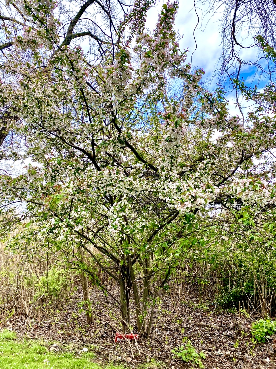 I love this photo so much! There are a bunch of trees all together... white and pink flowers, I don’t know which is which. Sooo coool ... And those shades of green are adorable too. It was a sunny morning, lots of sunlight.