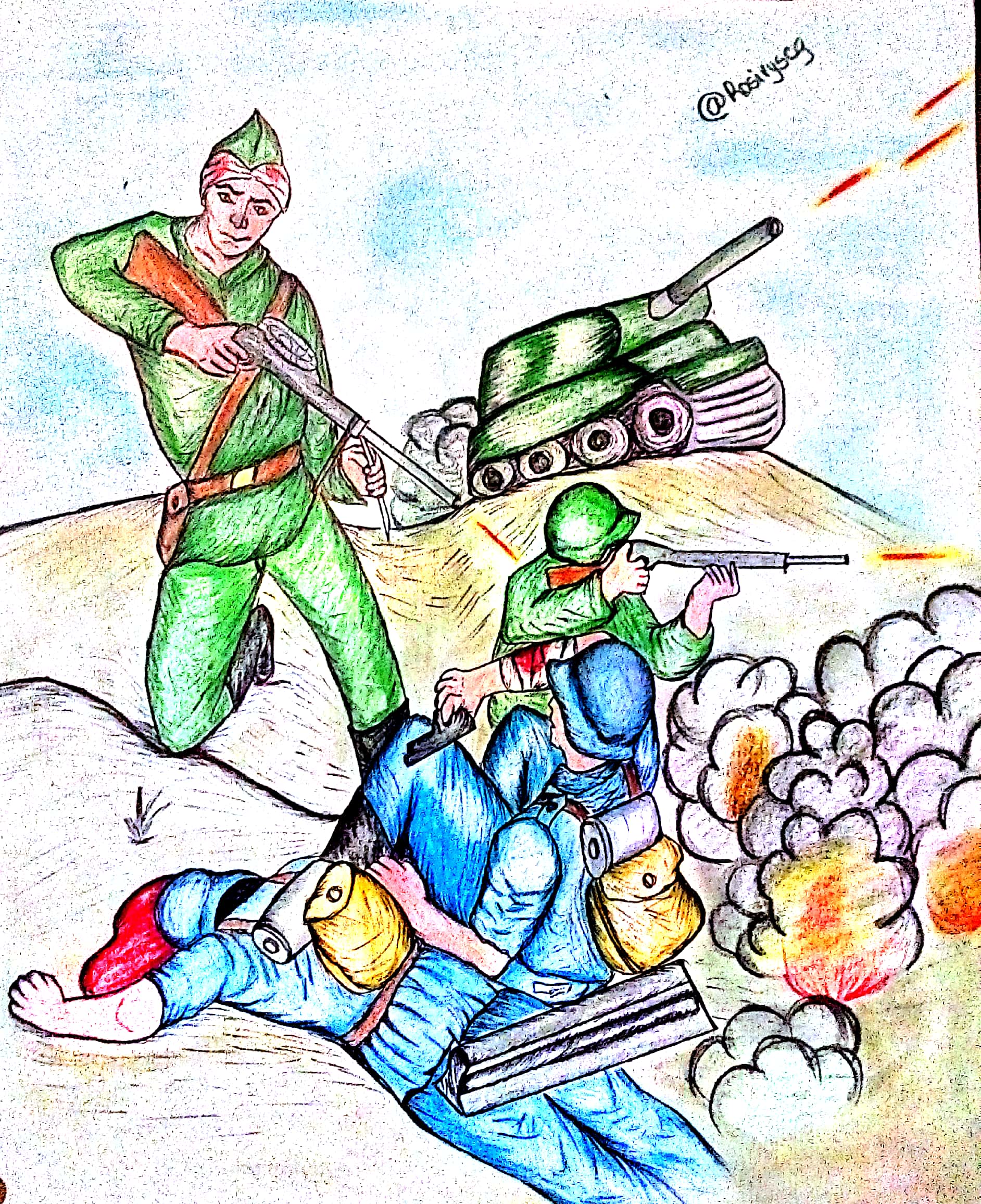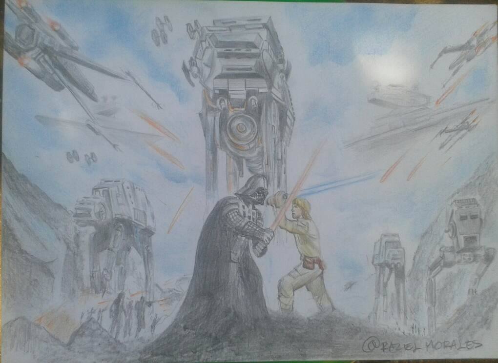 SECOND PLACE! @razielmorales nabs second place with her entry, ““Trial by Comics new theme "War”. I’m more of a Trekkie myself, but this Star Wars piece really captured the tense battle from Return of the Jedi. I love the composition and drama between Luke and Vader. The ultimate space fantasy war between good and evil. Congratulations, @razielmorales! 10.000 SBD’s to you.