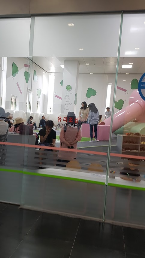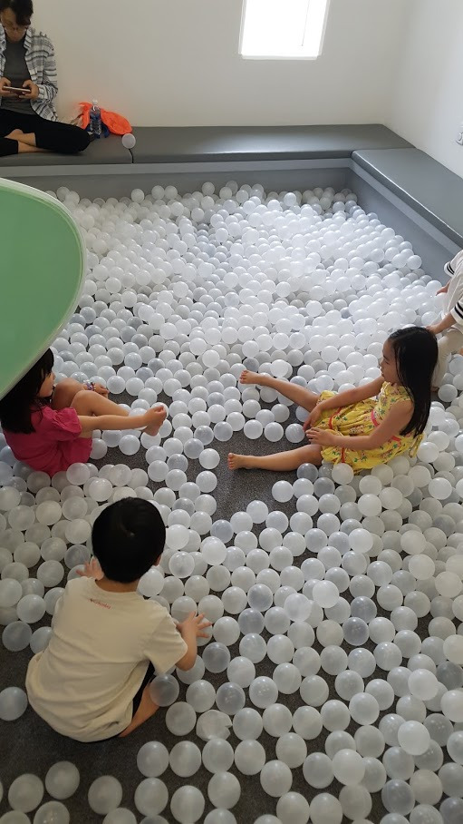 M1이 주차장이고, 아래 B1이 어린이 미술관, 1F,2F가 프로젝트 전시관이다. 그리고 1층에 분홍색 미끄럼틀이 있는 볼풀 키즈 카페가 있다. 기특하게 야외공간에서 친구를 한명 사귀더니, 볼풀에서 같이 신나게 뛰어 논다. 키즈룸-놀이방은 부모 동반 무료 입장이고, 자원봉사자들이 잘 관리하고 있다. 7세까지만 이용가능하다.