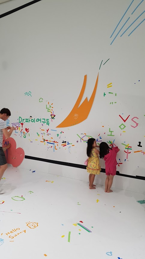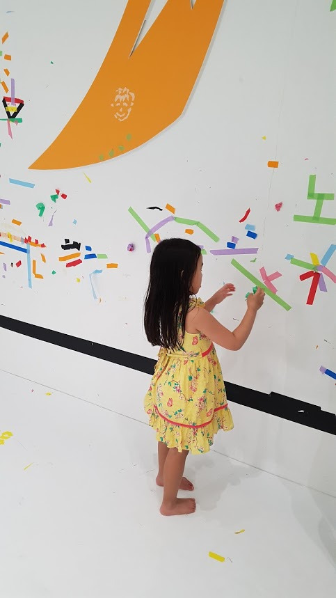 또 옆공간에 어린이 미술관 작품과 연계해 테이핑으로 하얀 벽과 바닥을 꾸밀 수 있는 공간이 있다. 아이들이 작품을 보고, 자유롭게 자신을 표현해 볼 공간이 있어서 참 좋았다. 다양한 색의 종이 테이프로 꽃도 그리고, 이름도 써 본다.