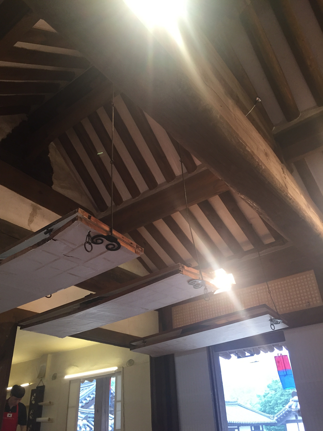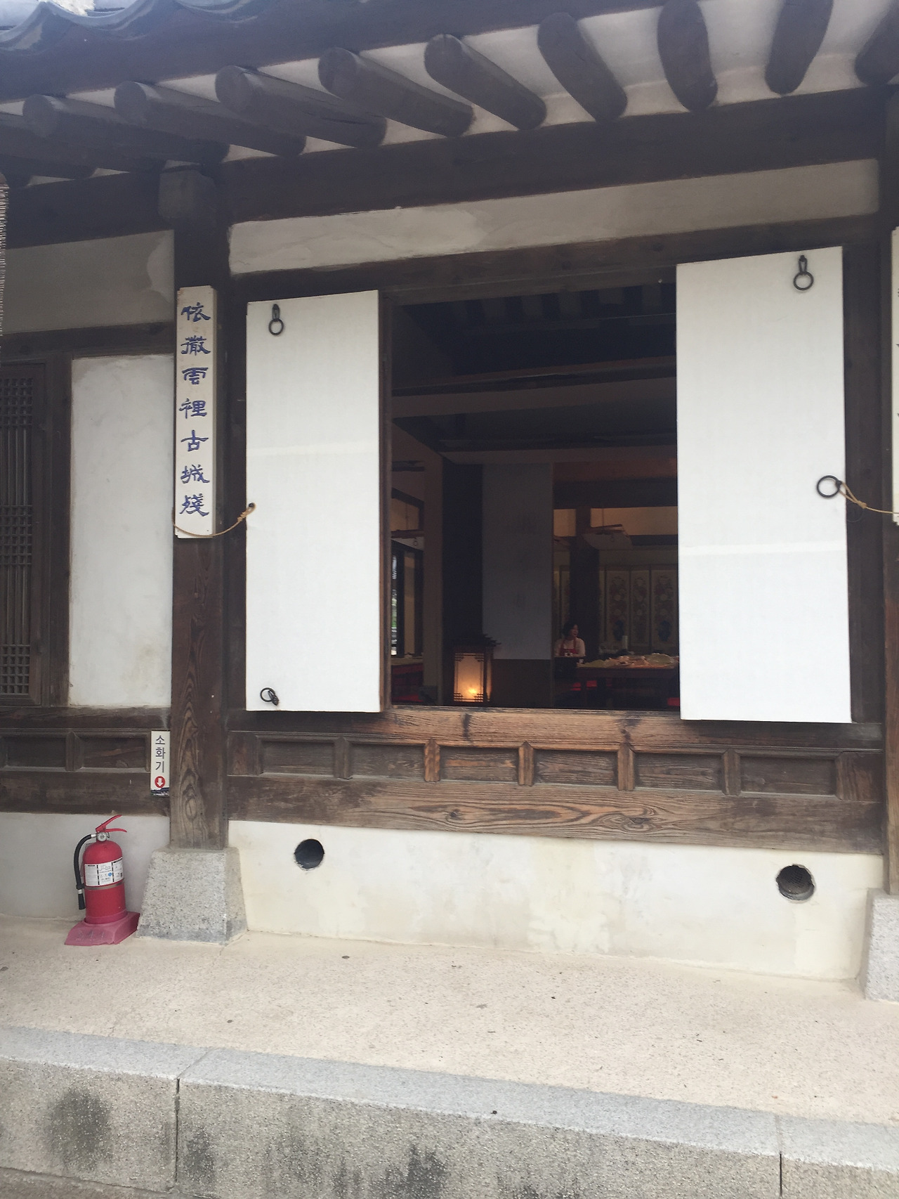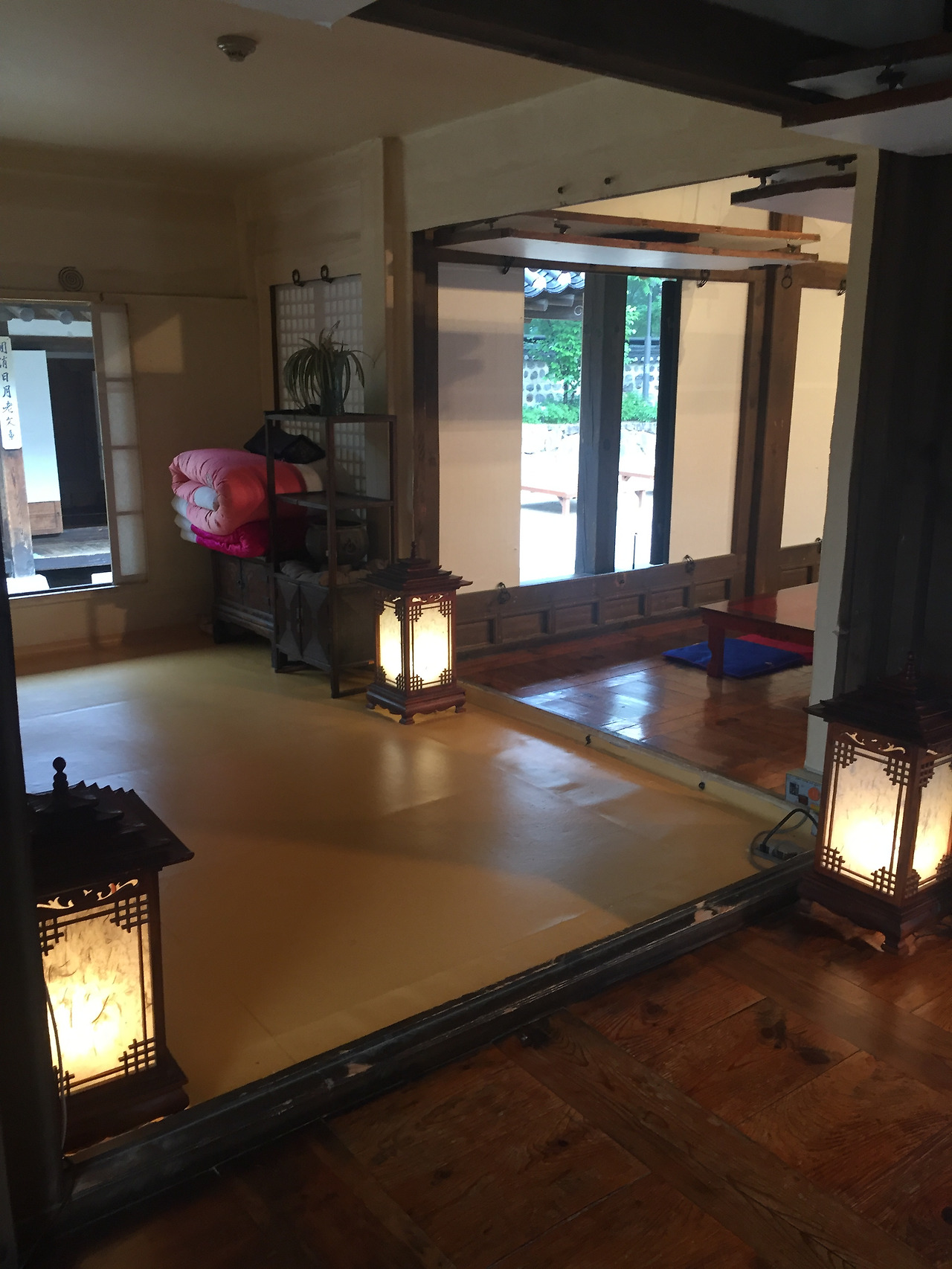 떡만들기는 이 한옥중 하나에서 진행된다...덕분에 -들어가지 마시오-안에 들어가, 천장이며, 바닥이며, 방방마다 구경할 수 있었다...1인당 만원이면 모양만 내는 떡만들기 체험으로 좀 비싸지만, 비오는 날 한옥안에서 빗소리 들으며 떡 만들어 먹는 재미가 좋았다....툇마루에 앉아 마당에 비내리는 모양도 보고, 소리도 듣고...높은 천장도 쳐다보고, Min Family's House민씨 가문집이라서 인지 천장이 높고, 공간이 정말 넓다..내가 본 한옥중 집안 공간이 제일 넓은 것 같다....한옥은 아담한줄 알았는데...이리 넓고 크구나...툇마루도 넓직하니, 좋다...한옥에서 제일 좋아하는 공간...내집이 짓는다면, 넣고 싶은 공간이 툇마루다...바깥 공기와 날씨를 그래로 느낄수 있는 실내도 아닌 밖도 아닌 이 열린 공간이 내가 한옥에 살았으면 하는 이유다... 바닦마루는 사람들이 손길이 뭍어 더 멋지다.