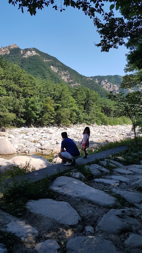 셋째날 뒷산으로 보이던 설악산으로 고고씽....나이드니 산이 좋고, 녹음이 좋다...계곡에서 물소리 들으며 여유를 부려보고 싶다...국내 여행 버킷 리스트중 하나였다....8년전 딸아이 임신한줄 모르고 올랐던 울산 바위....반갑고, 감회가 새롭다 ㅋㅋ 이제 내년이면 나 학부형인데...울산바위 오랜만이야...또는 못오르겠고, 그 옆 계곡서 좀 놀다 갈께....설악산 입구에 가니, 주차비 5천원 선물 내고, 설악산 입장료( 사유지가 포함되어 있단다..국립공원에 웬일이니...) 3천 5백원/인당-내고, 들어 간다....오른쪽으로 등반하지 않고, 왼쪽 탐방로 쪽으로 가면, 여러 계곡을 만날수 있는데, 그중 제일 가까운데 한곳만 가자...