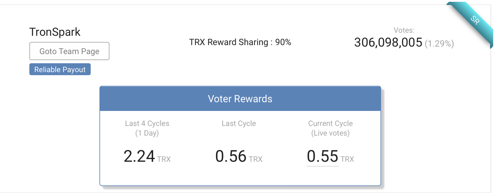 It looks like Tronspark offers the best rewards. You earn 2.24 TRX every day for every 10,000 TRON you have frozen/ voted for Super Representative Tronspark.