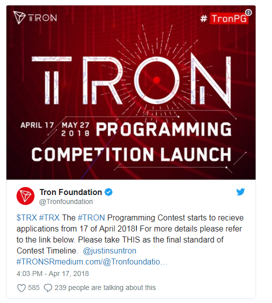 TRON [TRX] Latest – $1 Million USD Programming Contest Details Revealed