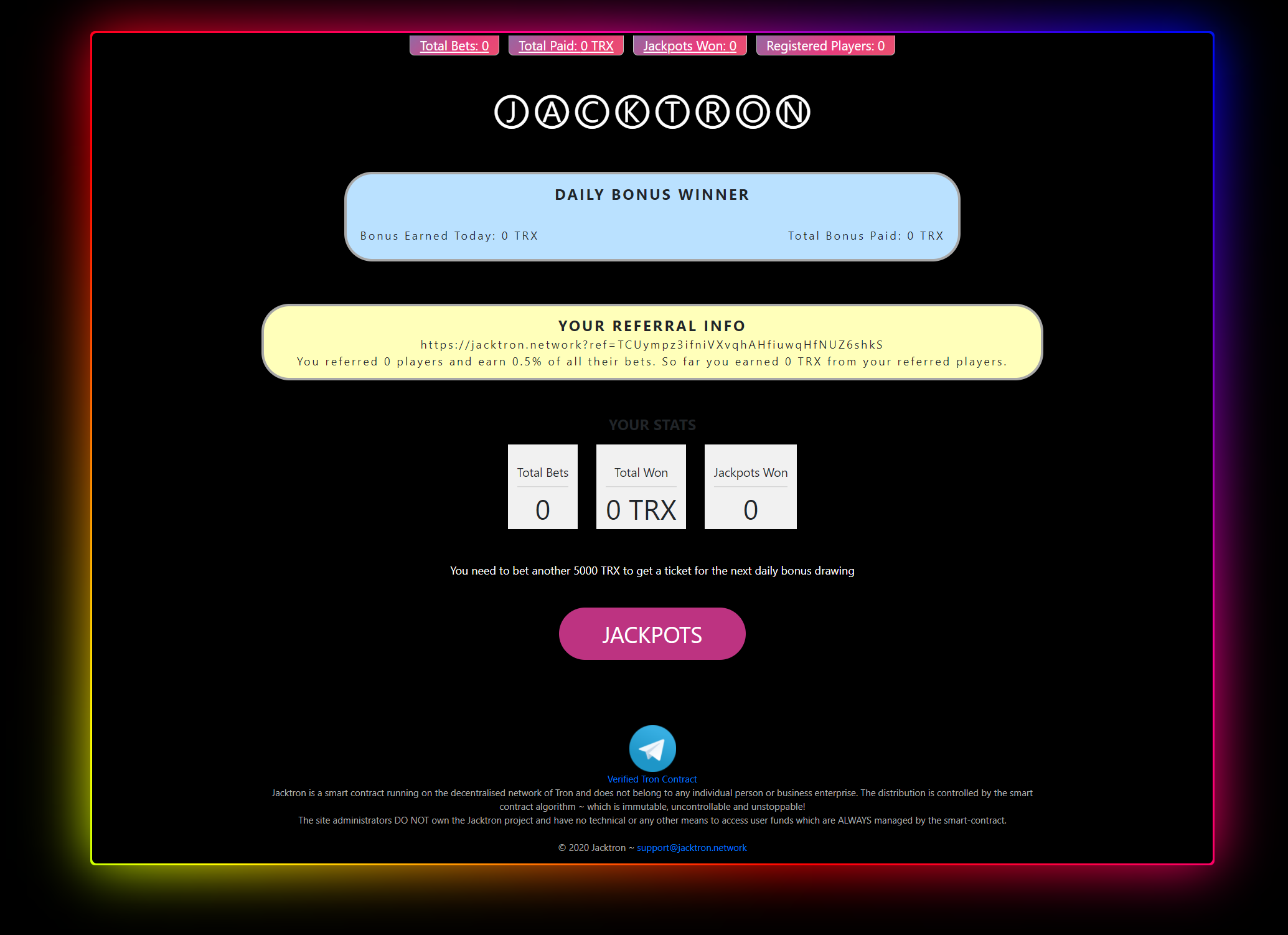 JackTron is simple betting game based on smart contract on Nile test net of Tron. You place bets on each round and once a day the game picks one player to win a jackpot.