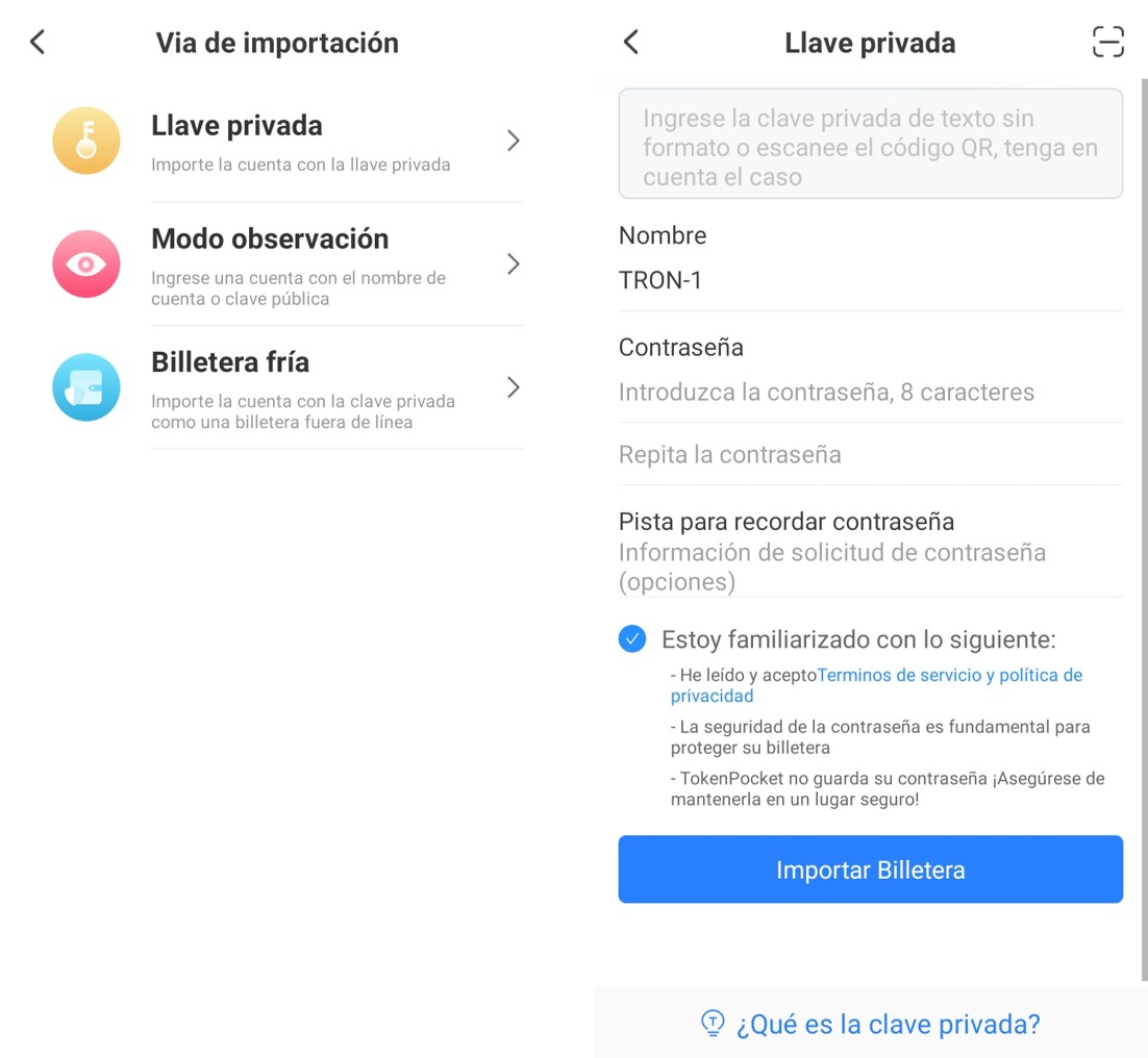 Si bien TokenPocket permite crear una billetera Tron, también permite importar una billetera Tron ya existente y esto se puede lograr mediante diferentes procesos, con el uso de claves privadas o palabras de frase mnemotécnica.