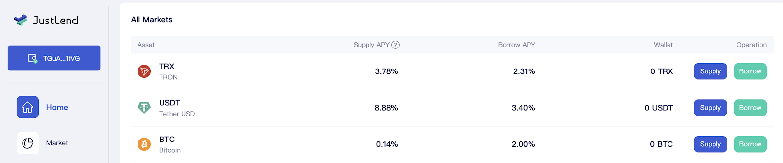 - Авторизуйтесь на JustLend.org и выберите соответствующий токен.