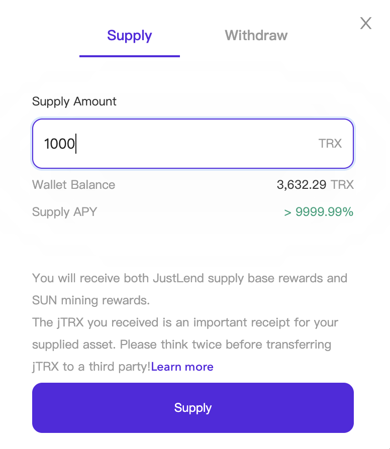 3. Введите сумму, которую вы хотите предоставить, и затем нажмите «Поставка» (если вы впервые предоставляете токен TRC20, вам необходимо сначала дать разрешение).