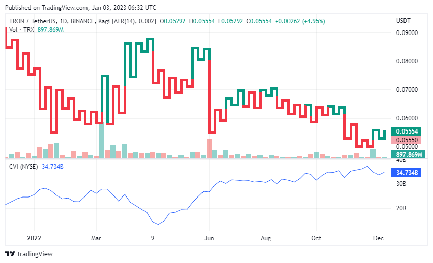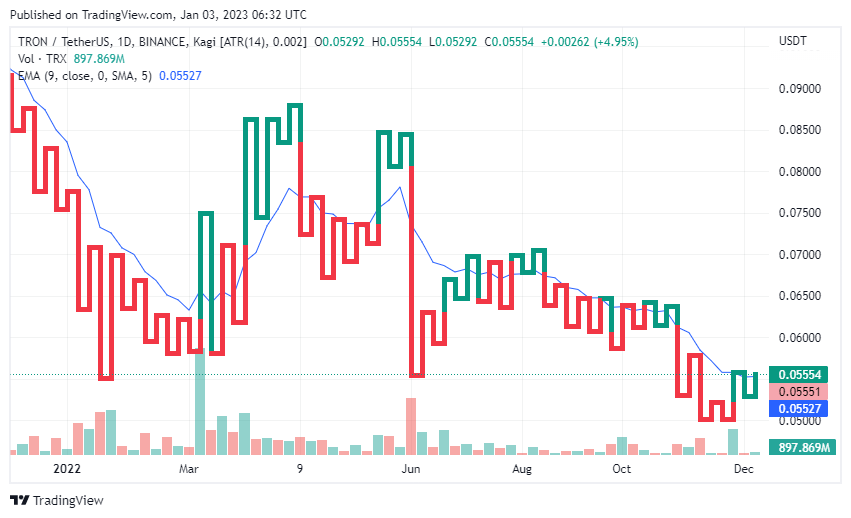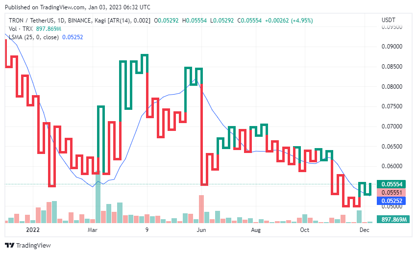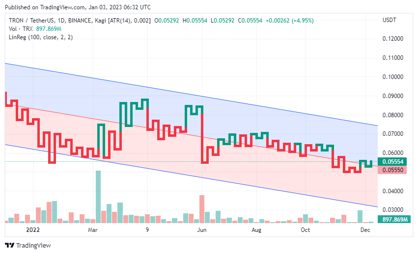 TRON price today is $0.055431 USD with a 24-hour trading volume of $133,626,396 USD.