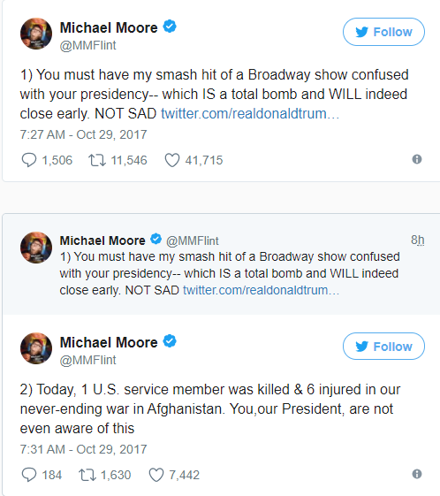 Trump tweets: “While not at all presidential I must point out that the Sloppy Michael Moore Show on Broadway was a TOTAL BOMB and was forced to close. Sad!”