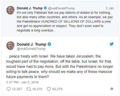 President Trump has recently made it clear, through media statements as well as Twitter, that the U.S. will withdraw funding to Palestine if they do not return to “negotiations” with Israel.