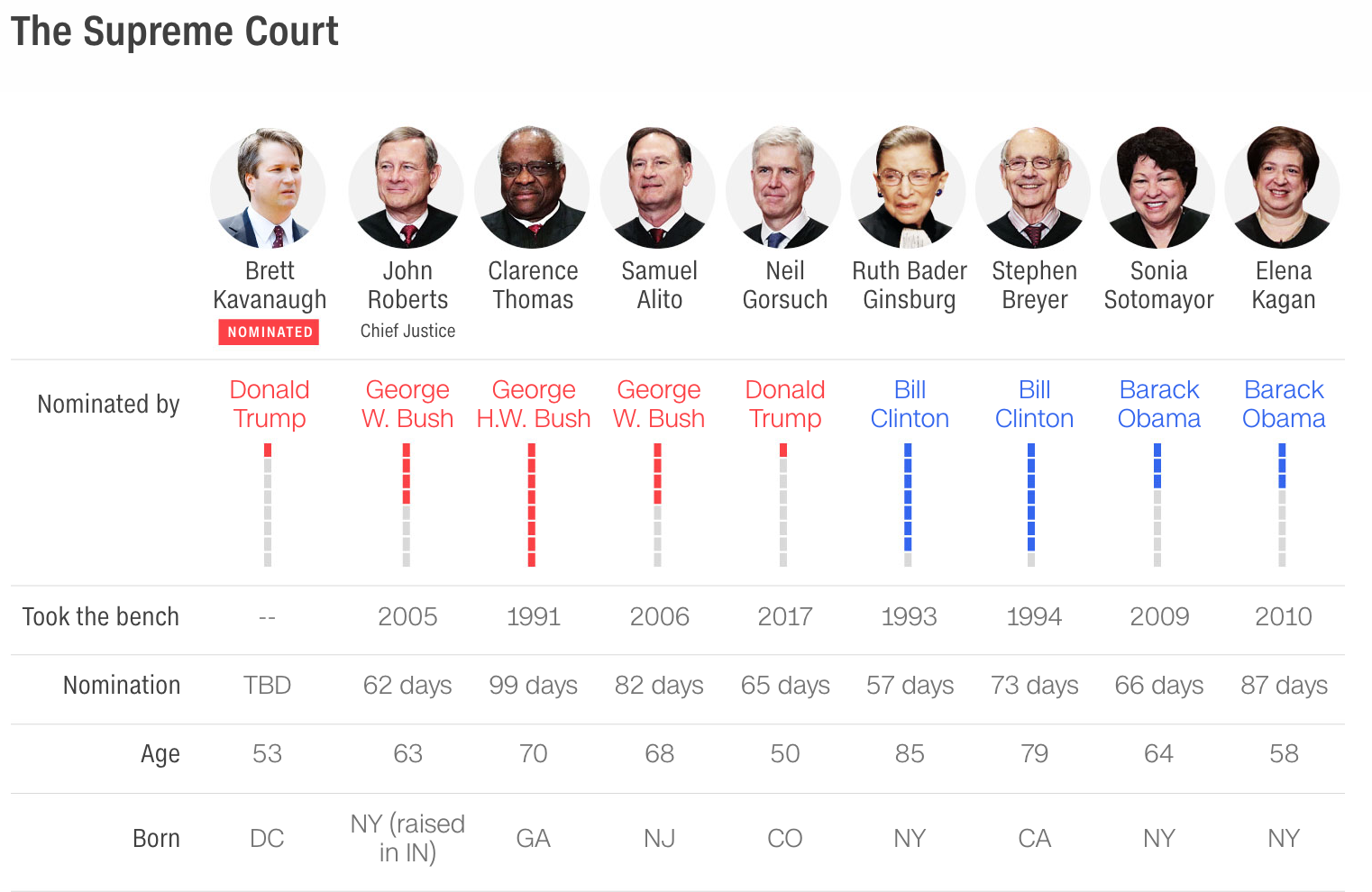 Judge Kavanaugh is particularly of the establishment. He grew up in Washington, graduated from Yale Law School, clerked for the man he would replace, Supreme Court Justice Anthony Kennedy, worked on the impeachment of President Bill Clinton and served in the Bush White House before landing a plum federal appellate court appointment — in Washington — at the age of 38.