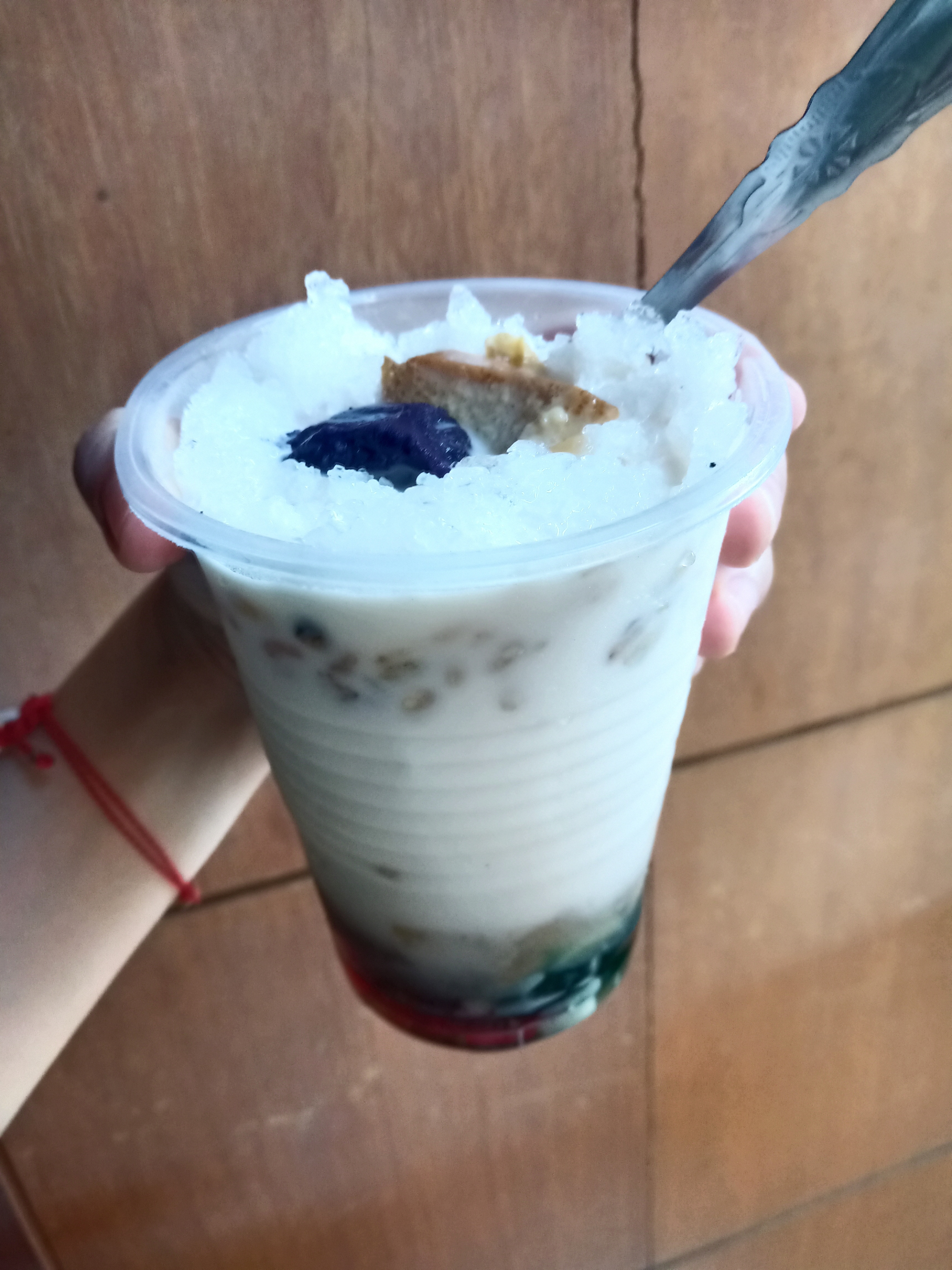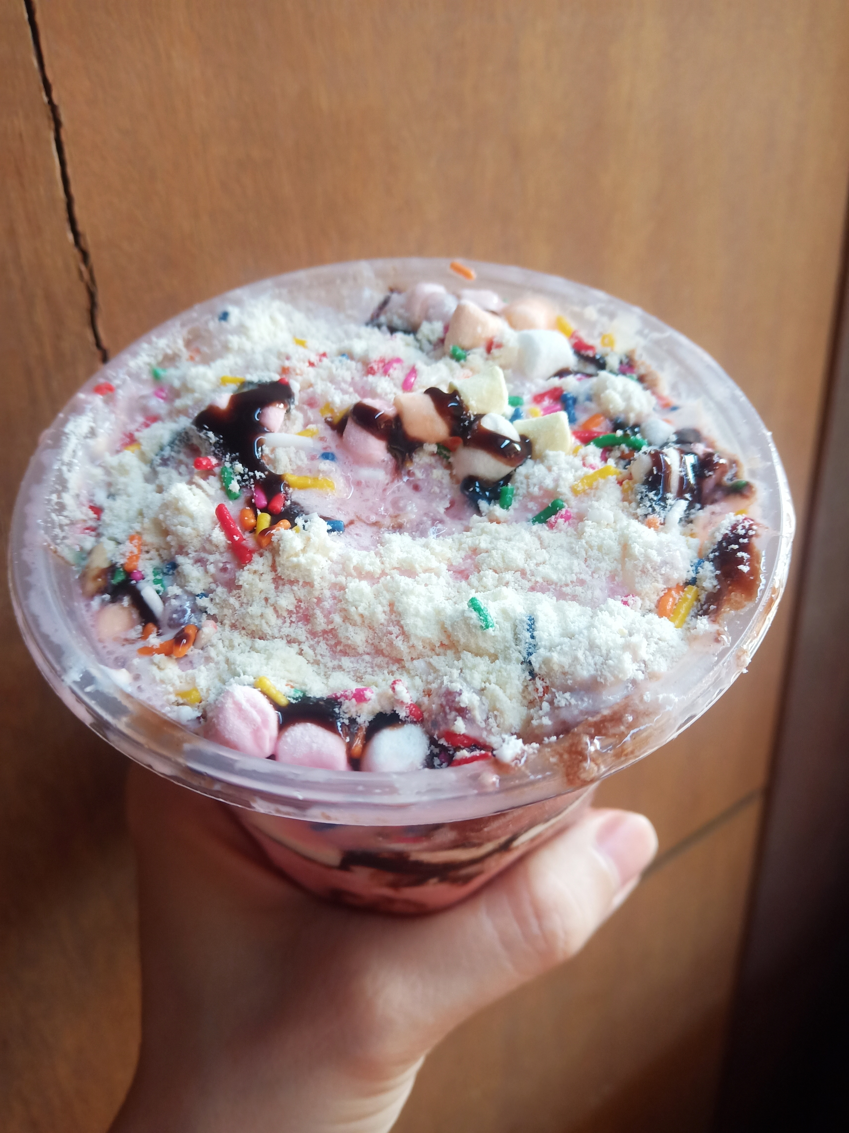 Pink food coloring with sugar, mallows, chicken syrup, shaved ice...