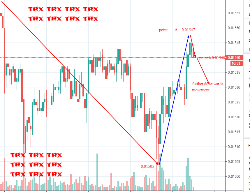 The above is the trx market in terms of USDT. Two points are being indicated. There is point A and point B . Before point A, the trx market can be seen to be trending in a downwards direction all the way to $0.01505 from its previous high of $0.01555. This downwards trend has been as a result of the sellers being more than buyers. This causes the market to resist moving upwards and gains a downwards movement. At $0.01505, more traders are starting to sell their previously bought trx in the hope that the trx market will continue moving downwards thus causing their holding to decline in value. This causes the market to gain an upwards pressure and moves slightly upwards to point A at $0.01547. More traders are starting to buy some trx at point A in the hope that the market will continue moving upwards thus causing their holding to increase in value. This causes the market to resist moving upwards and reverse where it further moves downwards to point B at around $0.01540. If the buyers will continue being more than sellers, then the trx market will continue moving downwards to around $0.01400. This is the right time to sell if you had previously bought and wait until it reaches $0.01400 so that you purchase