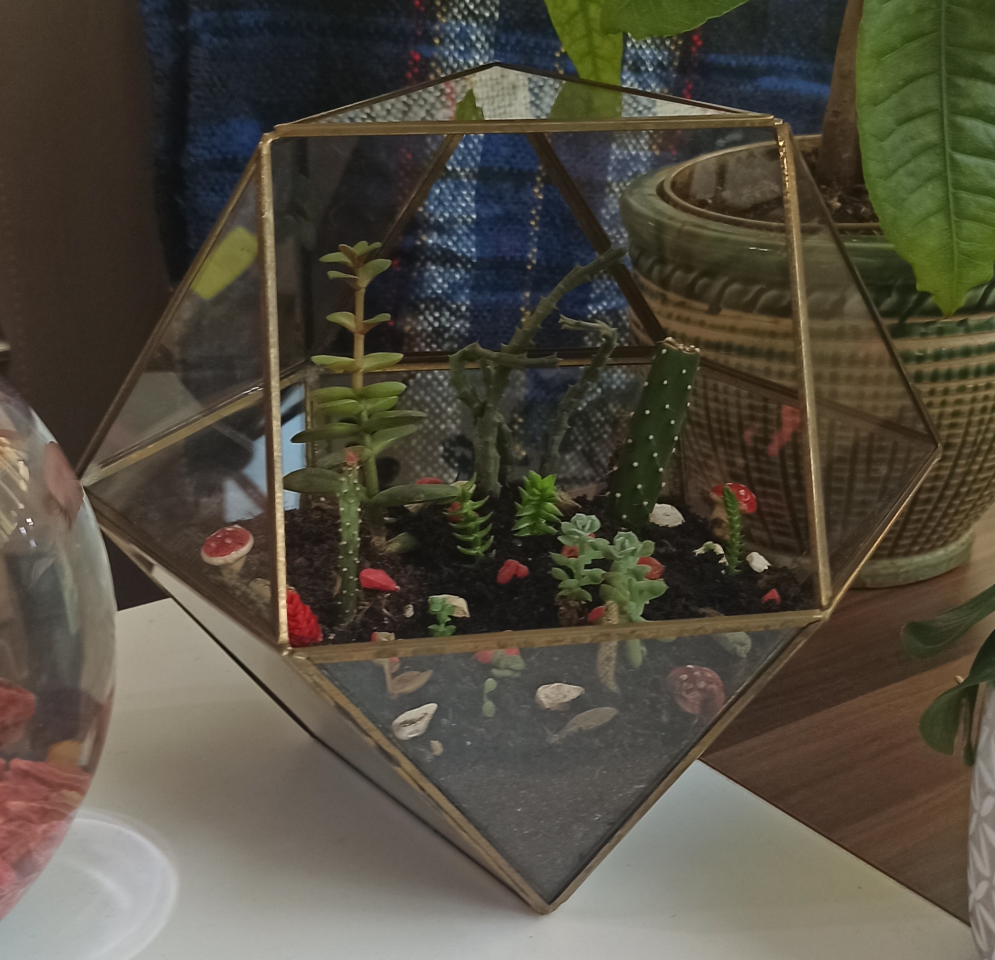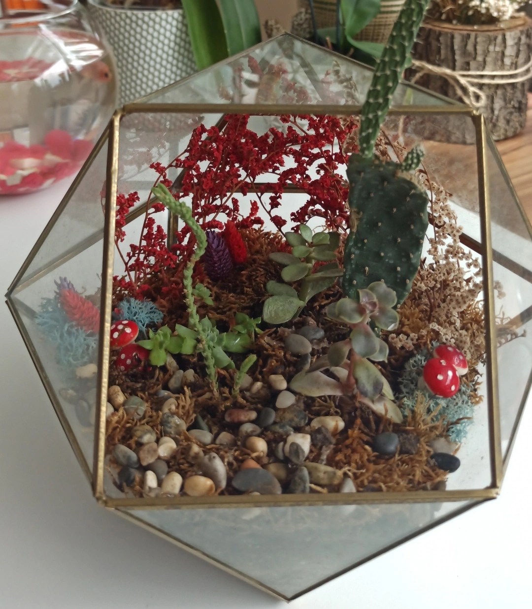 This flower pot was given to me as a gift, but as the days passed, it's grass died. The dry ornaments inside began to prevent it from getting sun, so I thought it was time to renew it so I changed it to it's current state.