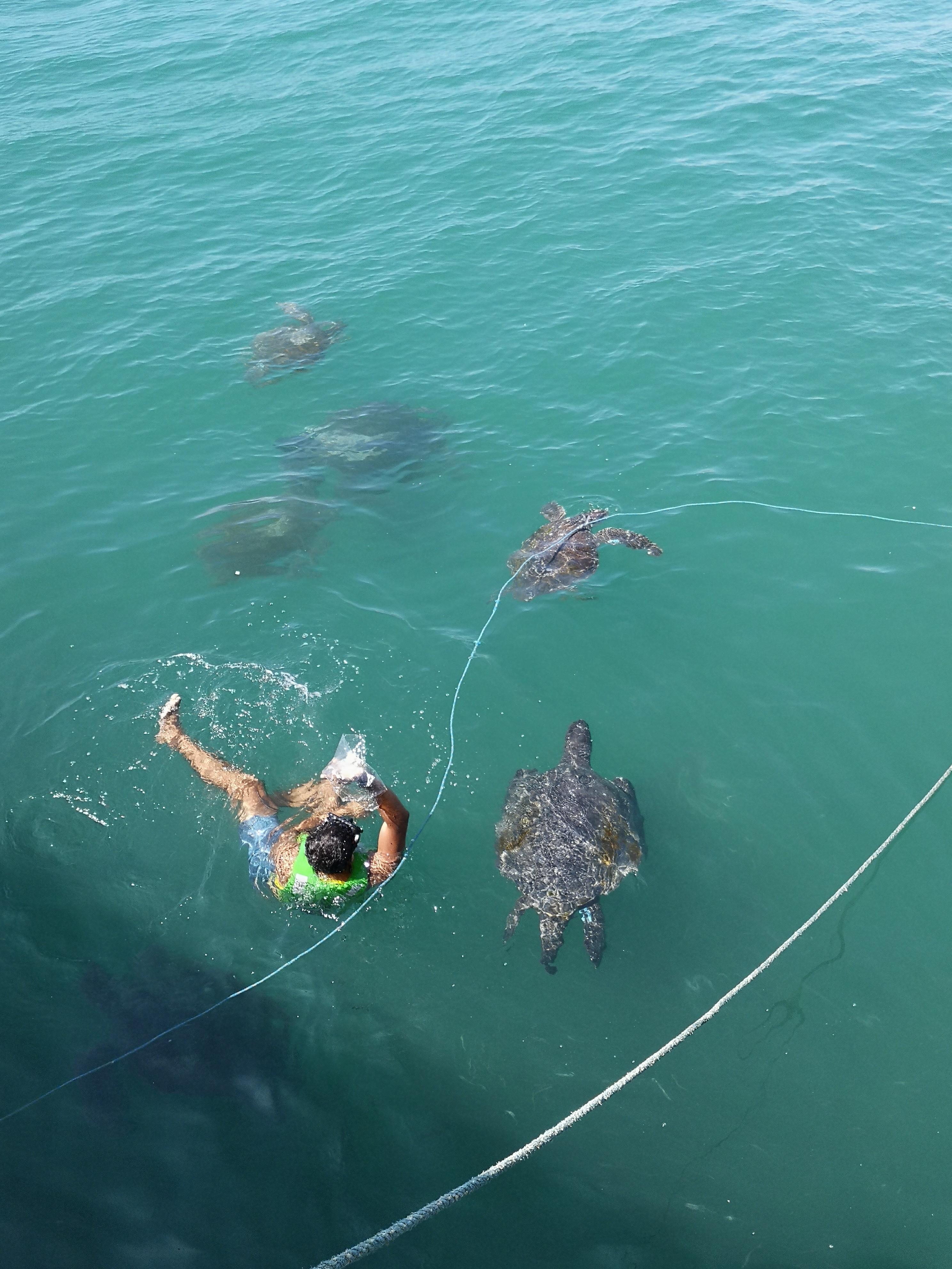 As we continued along the beach, I saw some fishermen throwing food into the sea, where at least a dozen turtles were circling. It was our first sighting of the turtles, and we quickened our pace to get to swimming before it got crowded. Once we reached our destination, I was only a few feet away from the turtles, and I was already in awe. The turtles looked so gentle and harmless, and they were so big! Zowie and I made our descent into the warm water with goggles and life jackets on, and we were off, swimming with the turtles. Anthony waited for his turn up top, taking pictures. At first I was a bit scared, but soon I lost myself in the moment and was swimming over, alongside, and between the bale of turtles, laughing and smiling uncontrollably. It was indescribable. We were even able to touch a couple of them as they nudged us swimming past.