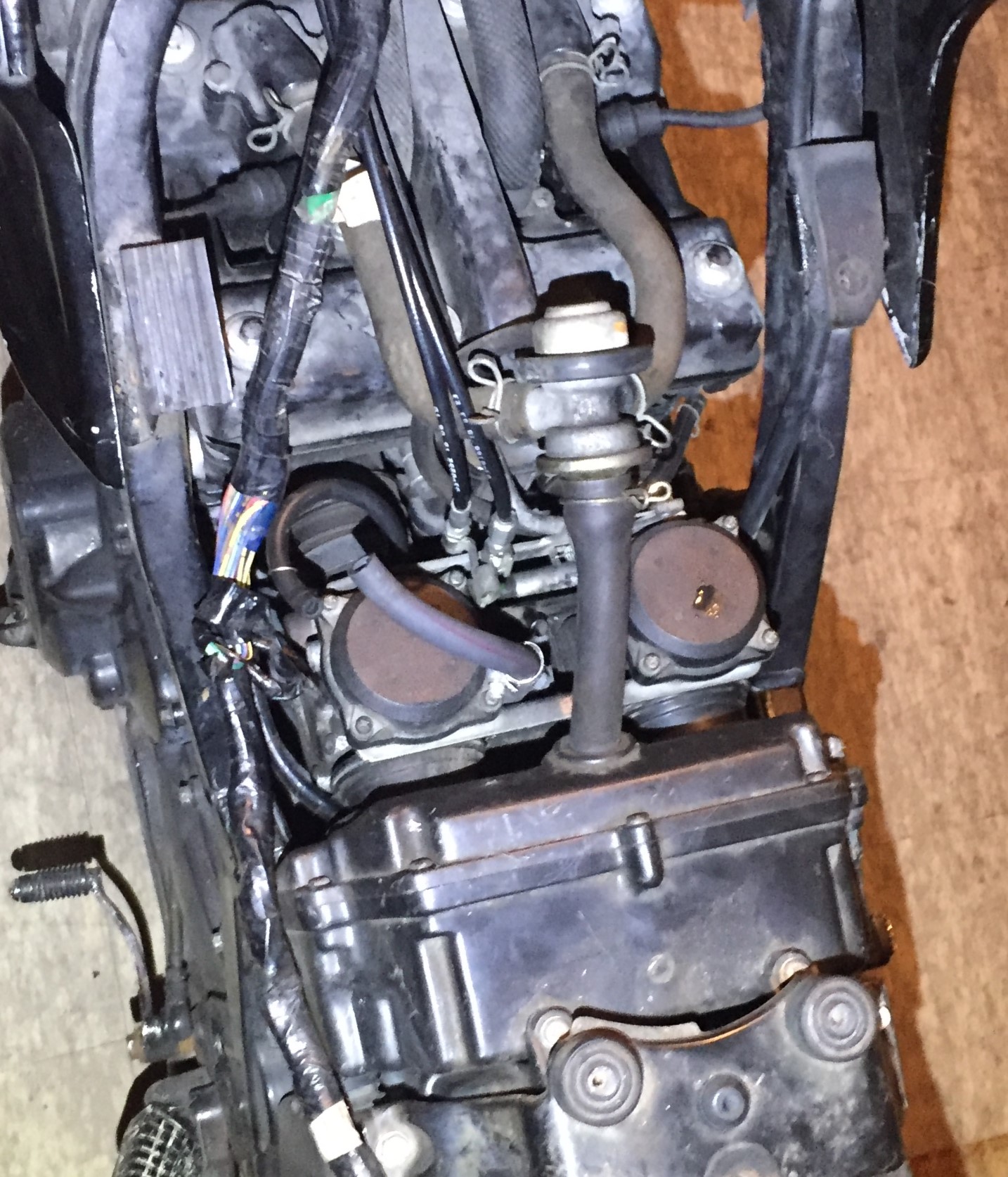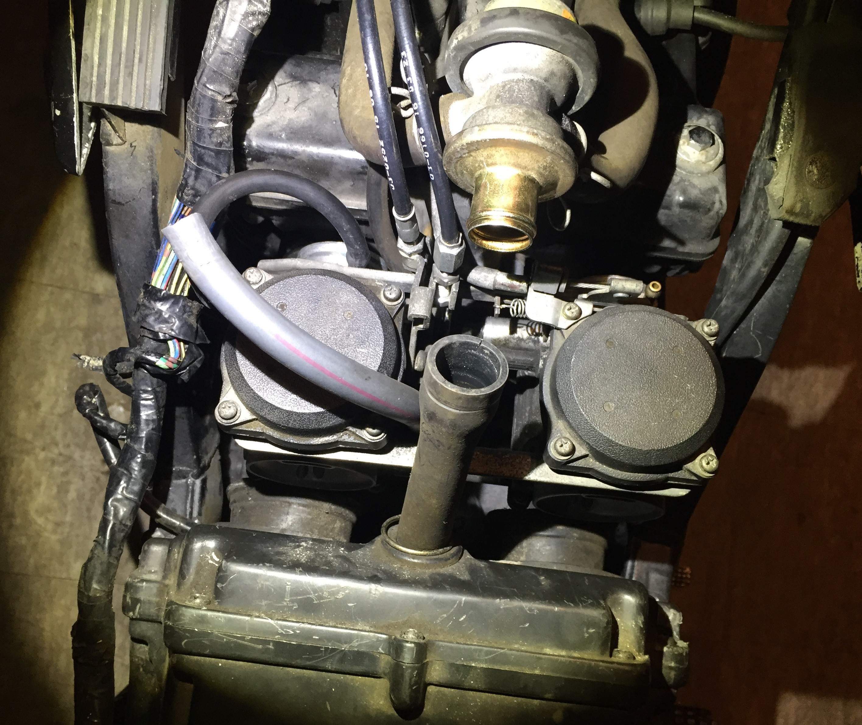 I loosened the clamps and springs securing the carbs in place. Once I had taken them out, I took precautions (paper towels) to prevent any unnecessary dirt or debris from entering the motor.