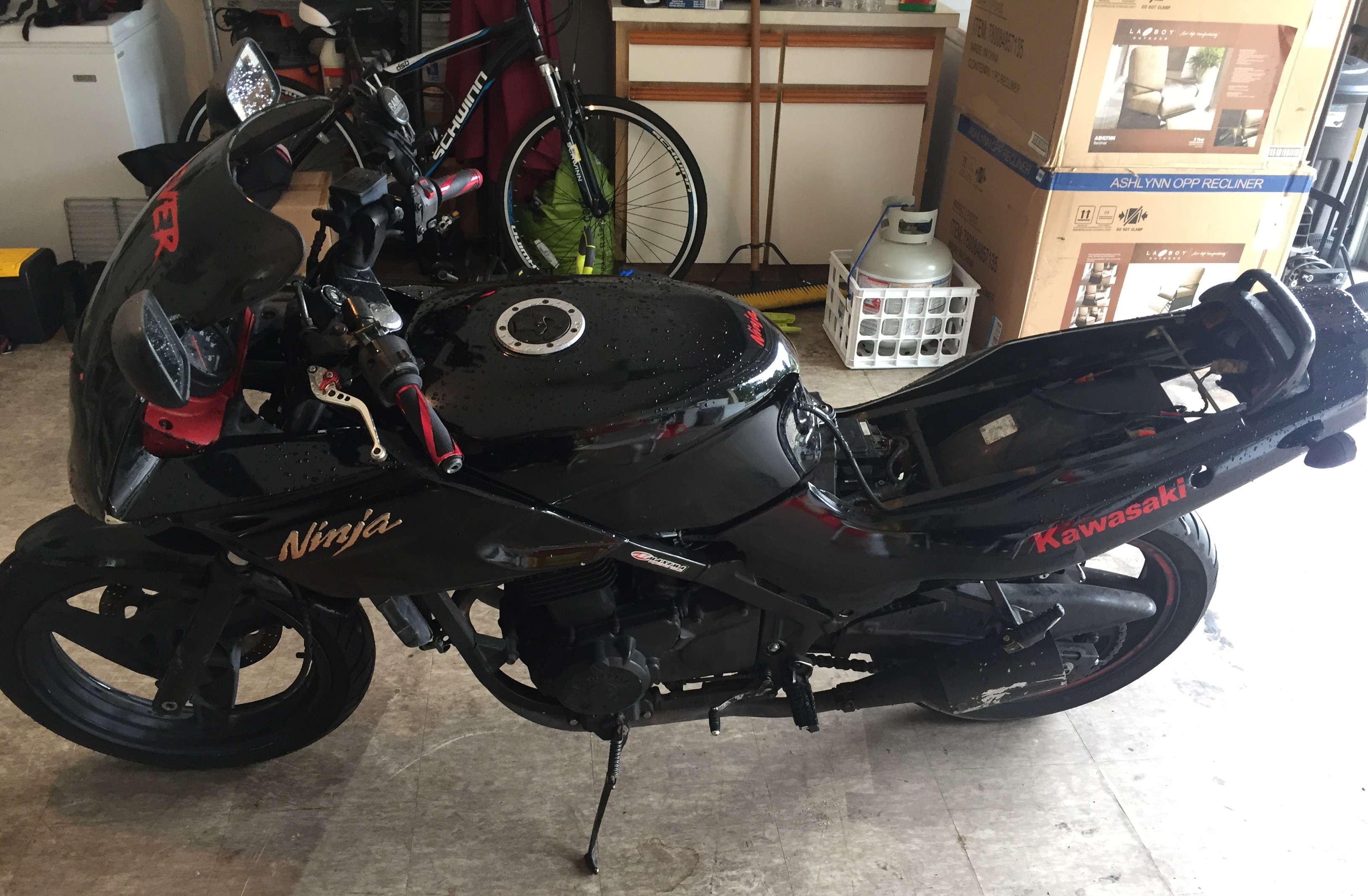Today I cleaned my carbs. This is the second time I've had to do so with Calypso, my Ninja 500. Because of all the rain and life, she has sat on and off in the nine months since her last cleaning. The other day I realized I could ride her no more without a good carb cleaning. She's been stuttering at stop lights, and the delay in gas had been elongating. So, I finally did the deed. This post will be a walk-through of how I cleaned my motorpickle's carburetors.