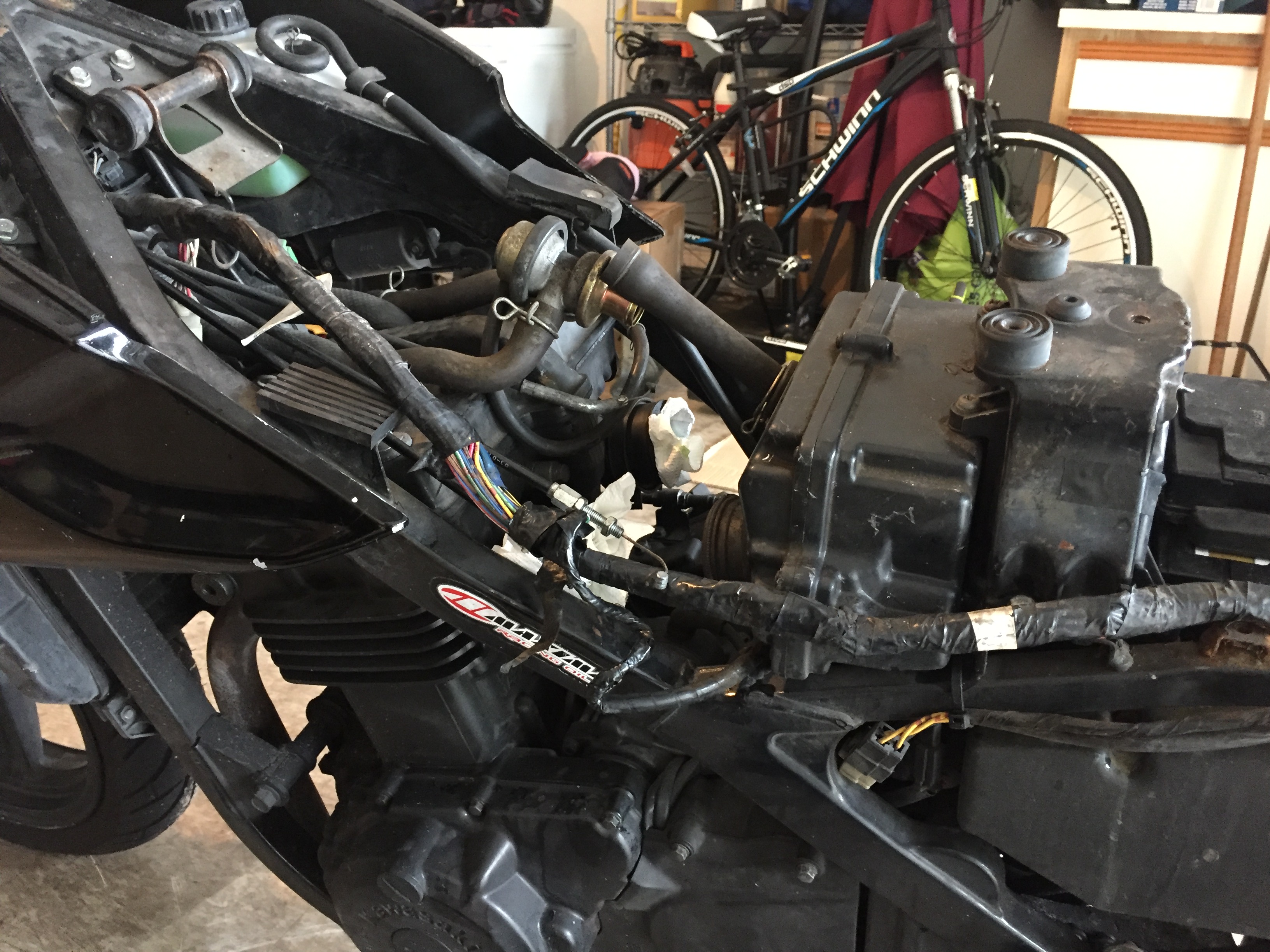 Once everything was reassembled, I started putting my bike back together. It took so much effort to jam the carburetors back into Calypso. "No, Anonymyst, I don't want those anymore." I included a dramatic photo of a single drop of my sweat that I shed because it took so much effort to get this shit back where it goes.