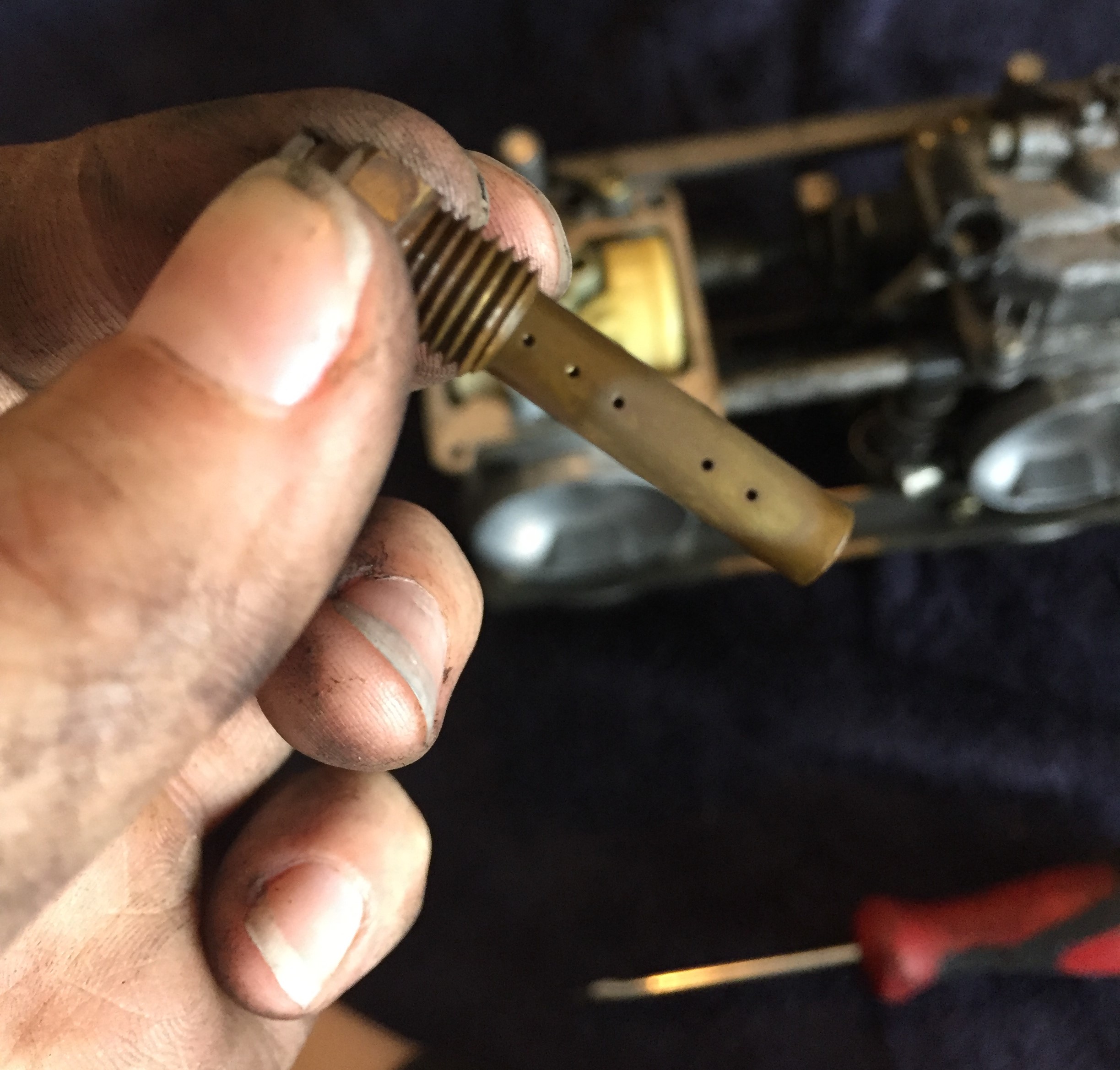 I unscrewed the main jet, and below I have included a close up of it. As you can see, it is lined with holes, through which gas travels. In order for Calypso to function properly, those holes must be unobstructed. However, when she sits, unused, old gas will accumulate in those holes creating a problem for her future use.