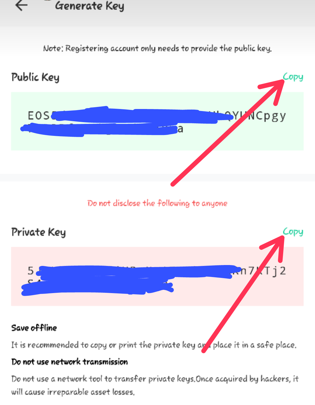 - Copy the Public and Private Keys carefully to your notepad or any secured place you can easily access when needed.