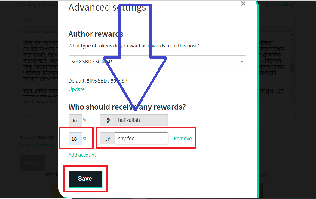 এখন উপরের চিত্রের মতো প্রথম বক্সে বেনিফিশিয়ারির পরিমান লখতে হবে (এটা কমপক্ষে ১০% হতে হবে, এর কম গ্রহনযোগ্য হবে না) এবং দ্বিতীয় বক্সে shy-fox লিখুন। এরপর Save এ ক্লিক করুন।