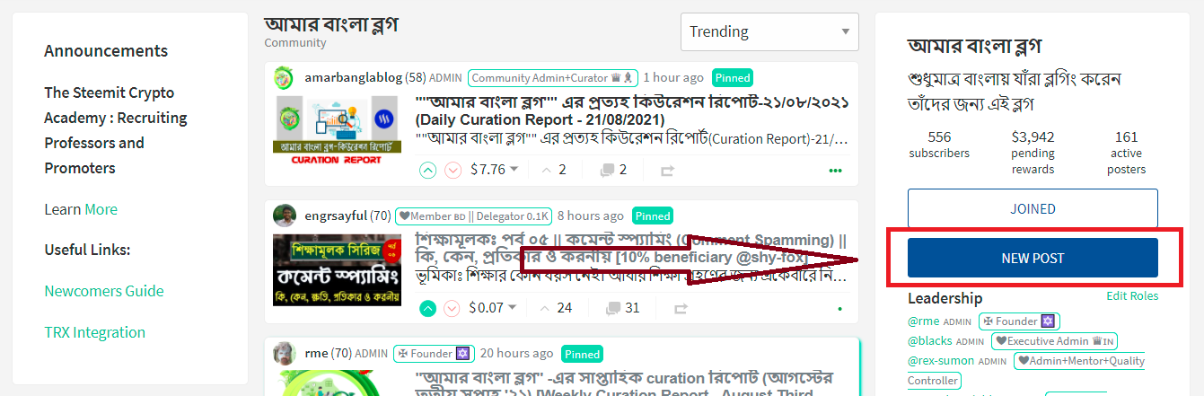 প্রথমে আমার বাংলা ব্লগ কমিউনিটির পেজে প্রবেশ করুন এবং New Post এ ক্লিক করুন।