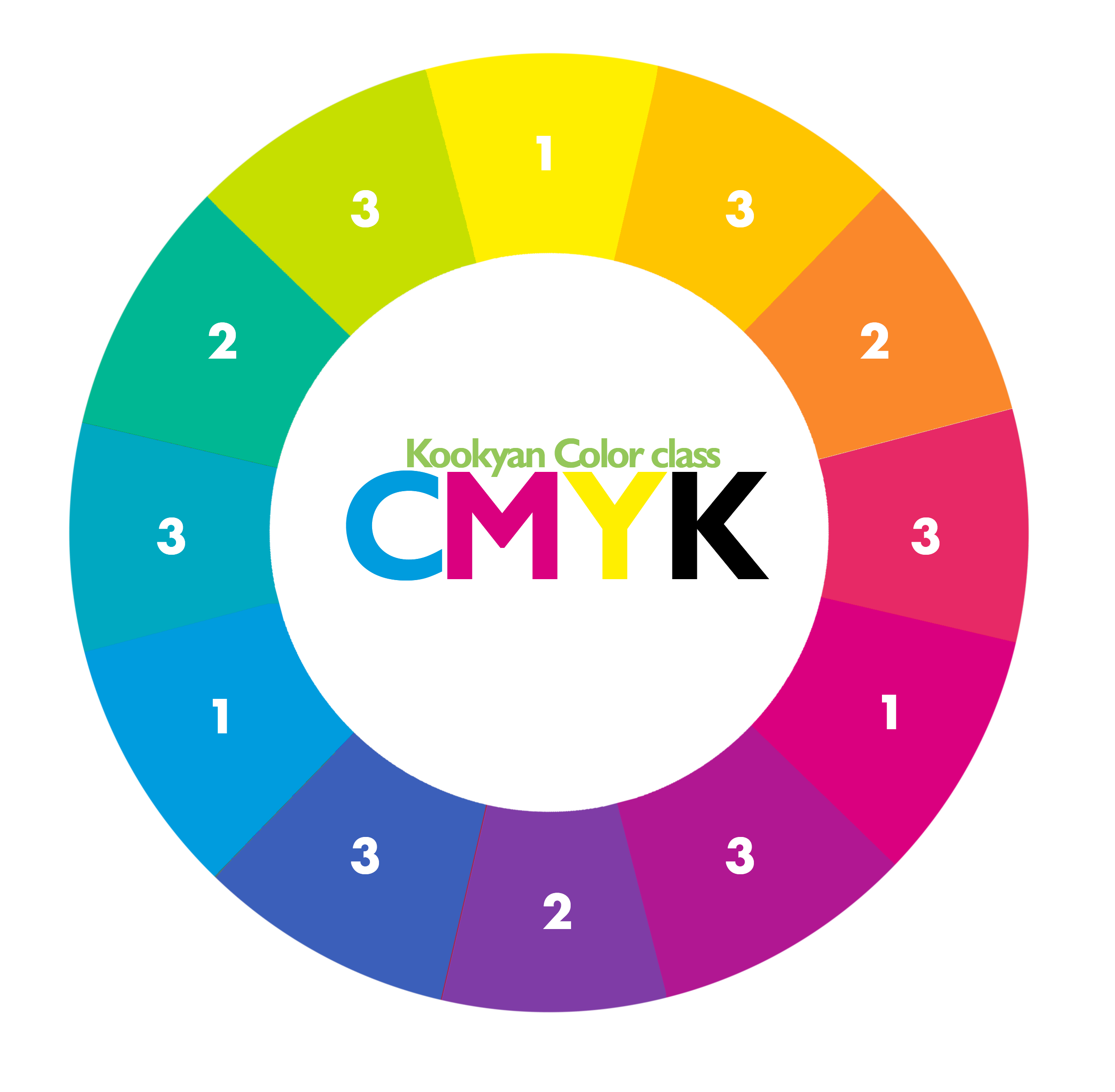 The CMYK scheme works in four colors, with the colors cyan, magenta, yellow and black. These four colors are mixed with different percentages to achieve any tone, represented 0% an addition of no color and 100% a full addition of the indicated color.