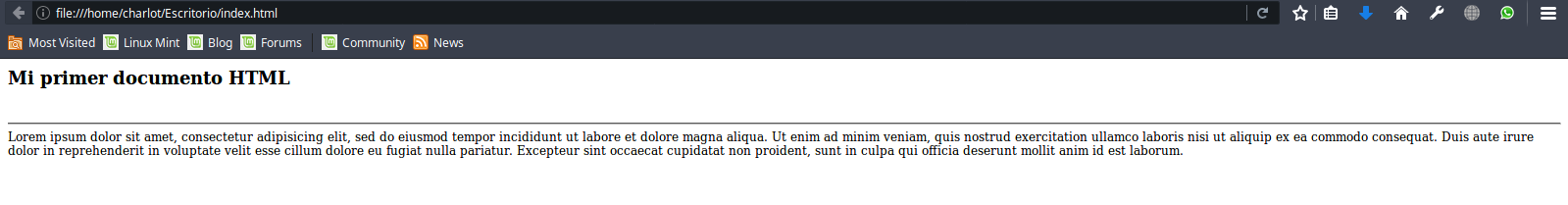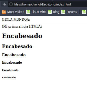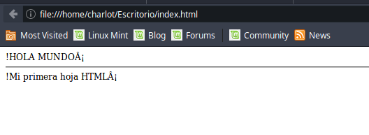 la etiqueta br dara un salto de linea entre "!HOLA MUNDO¡" y "!Mi primera hoja HTML¡" la segunda trazara una linea entre las dos palabras. y obtendremos un resultado como el de la (imagen 2)