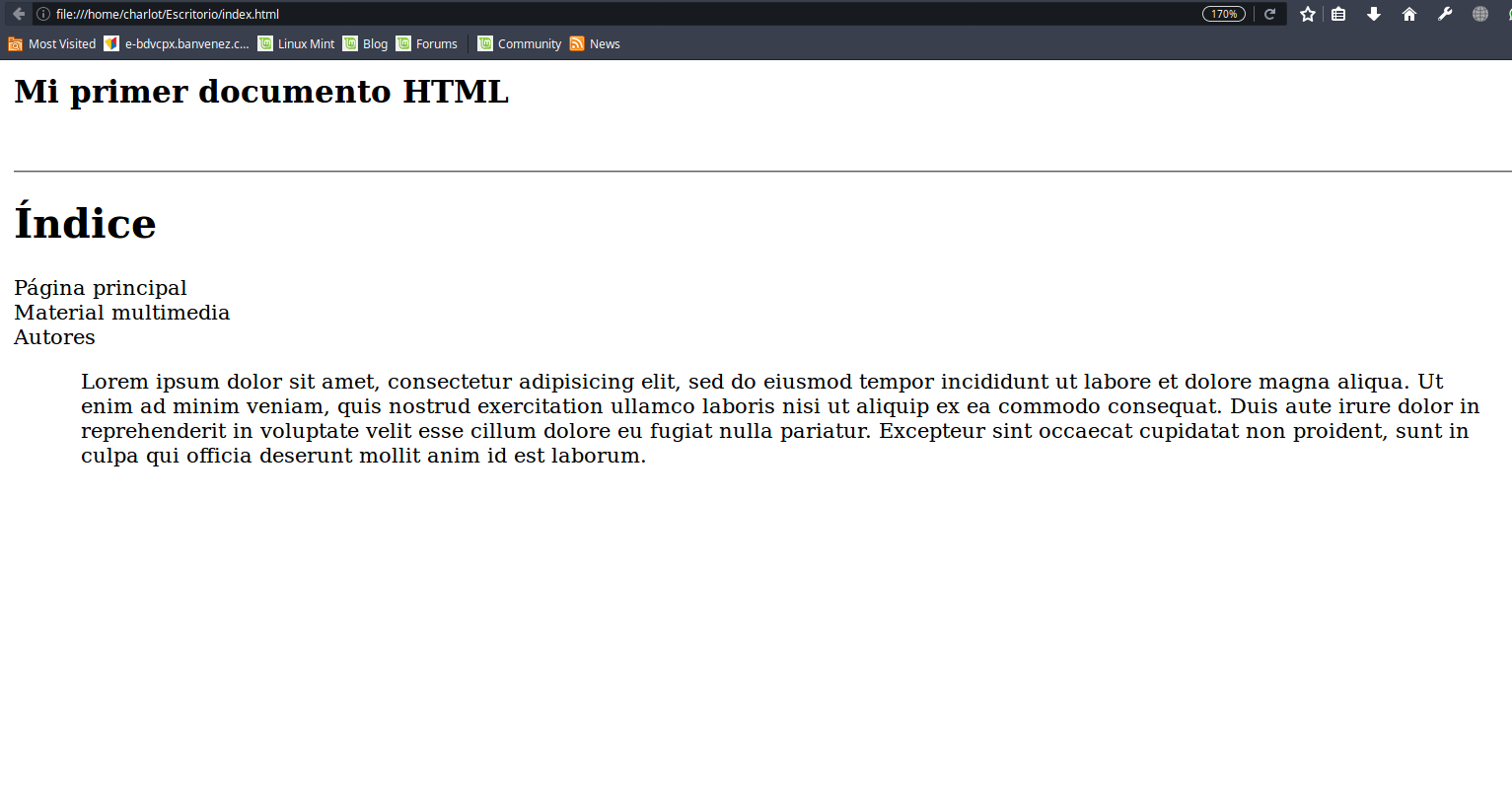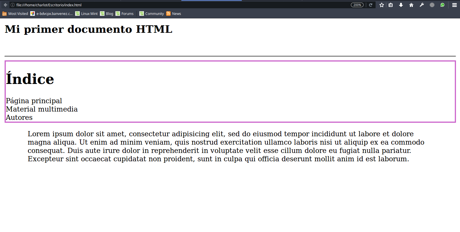 Hemos empleado la etiqueta para crear un bloque, que hará las veces de índice de contenidos. Visualmente la etiqueta no provoca ningún cambio, pero en la estructura interna del documento hemos aplicado una división muy importante. La imagen 4 muestra el texto del ejemplo; no hay ninguna diferencia visible.Probemos ahora a aplicar una modificación a la apariencia de ese bloque, añadiendo un estilo de borde a la etiqueta < div>; quedaría así: