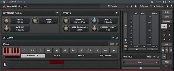 This is MAutoPitch. The 3 main things to know about here are the ‘Depth’ and ‘Speed’ knobs as well as the ‘Scale’ interface. Depth is how much Autotuney it is, speed tells you how fast it corrects the pitch ( like an attack envelope) and the Scale section lets you pick the notes it won’t tune to. I was in D-Dorian, so I marked all the black keys to not be pitched to.