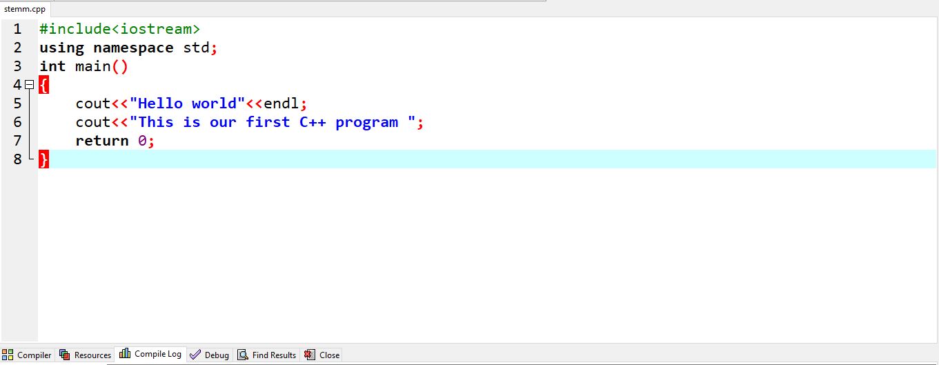 the basic syntax of a very basic program. We write our code in the main function. So lets write a simple program that print "Hello World" and "This our first c++ program.