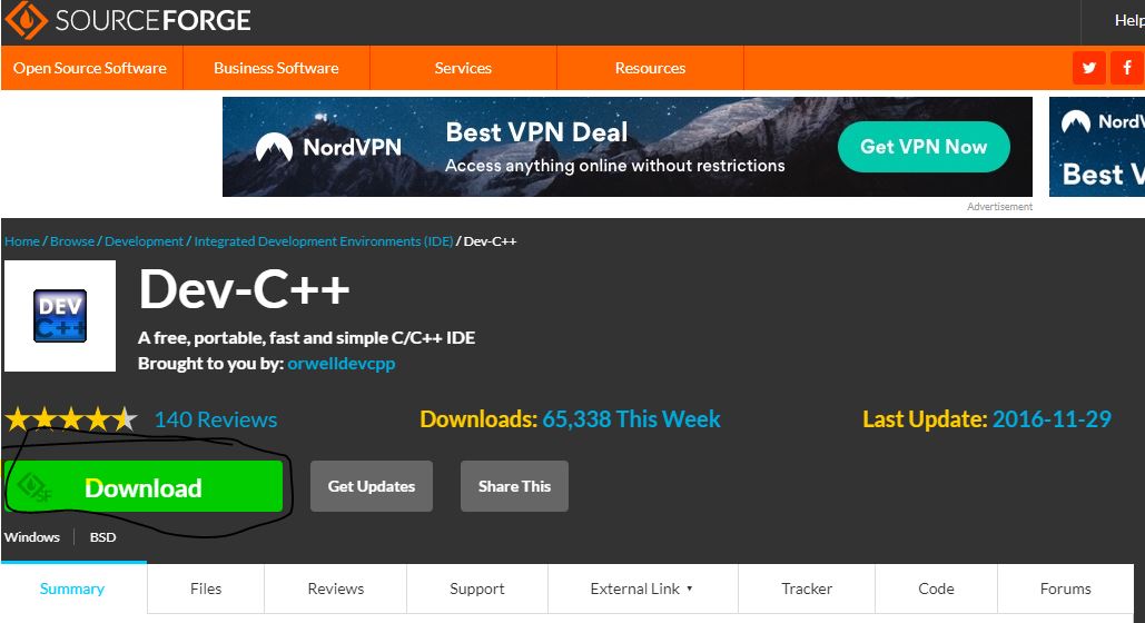 After clicking on the link click the download button as show in the picture below and download the Devc++ compiler as i already have that compiler so let skip to the compiler