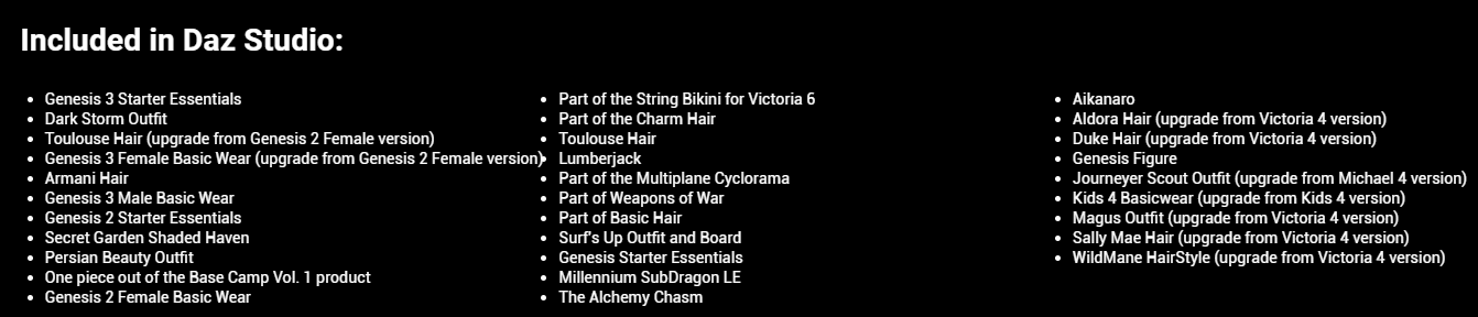 Daz studio comes with the following free products at the time of this writing. They will likely add more and possibly remove some (though I have not seen them ever remove any) in the future.