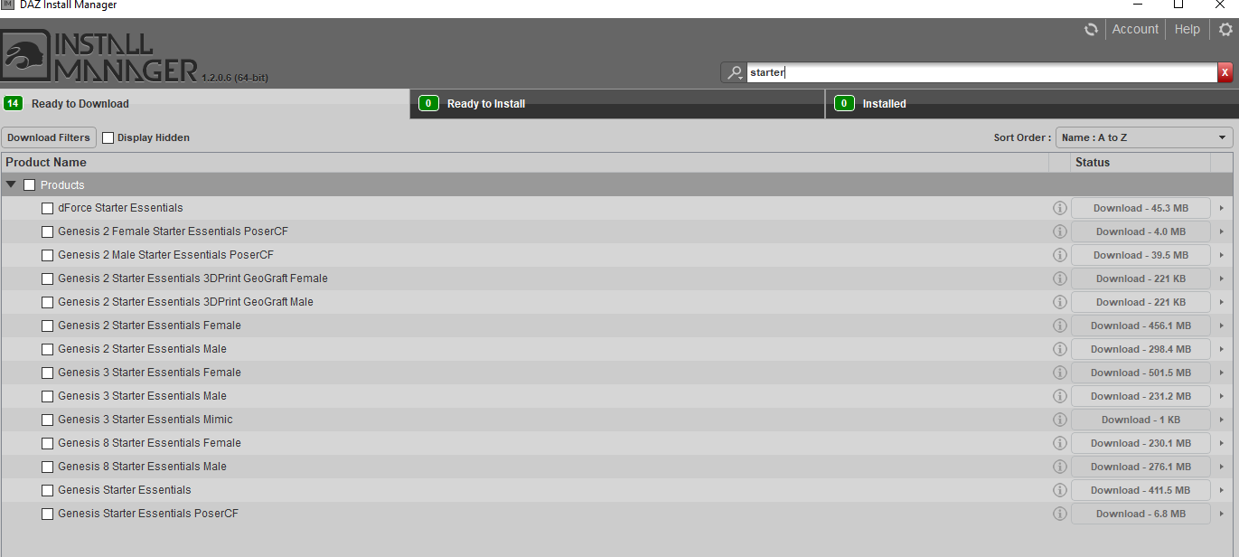 Inside the Daz Install Manager let's go ahead and install all of those starter essentials.
