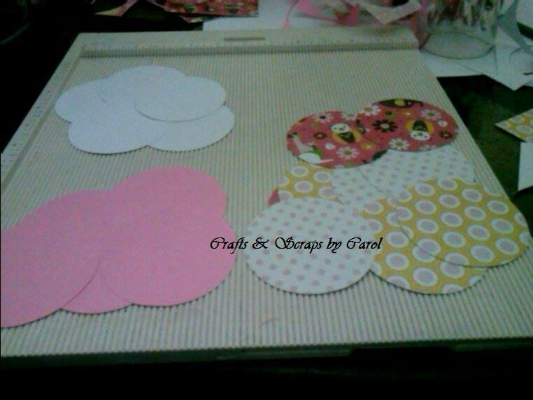 PASO 11: Ahora vamos a trabajar con los círculos que ya deben tener cortados. Yo voy a trabajar con 3 colores ( Blanco, Rosa y cartulina Decorada ) como no tengo cortadores de círculos pues me toca trabajar a mano, jajaja