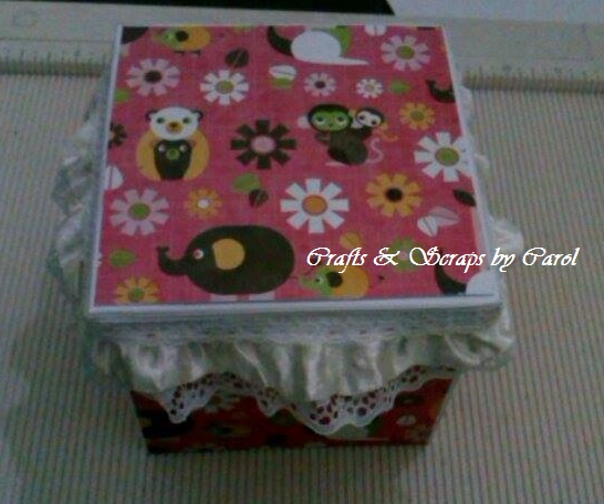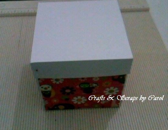 PASO 9: Si están usando cartulina corrugada pueden omitir este paso.Voy a cortar una pieza de cartulina decorada de 4" x 4" y la pegaré en la parte superior de la tapa de la cajita. Los bordes los voy a decorar con cinta de encaje.