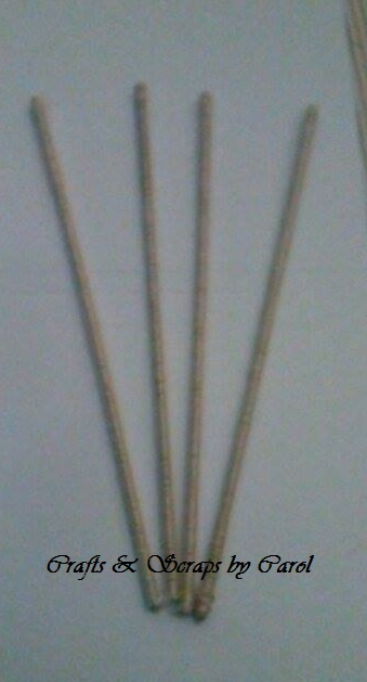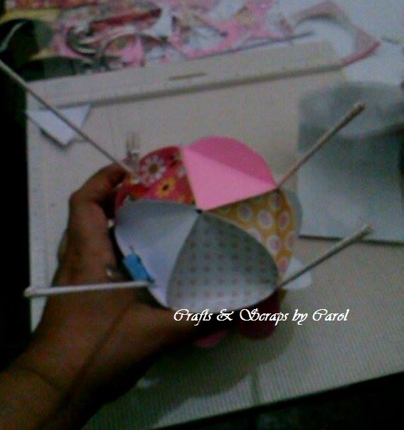 PASO 13: Vamos a fijar los palillos a la bola scrapbook, de esta forma y dejamos que se seque bien el pegamento.