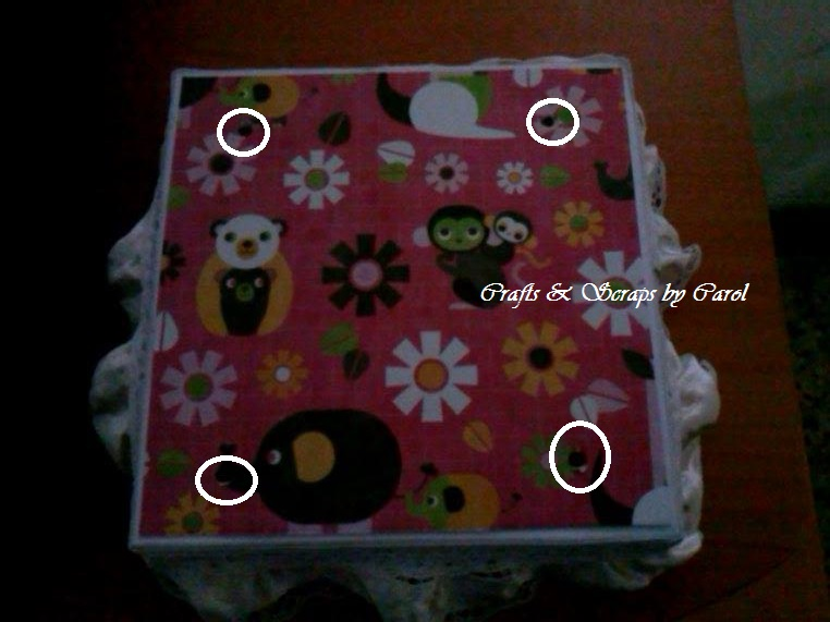 PASO 14: Ahora vamos a fijar los palillos en la cajita, Con un lápiz marcamos en la cajita el lugar donde cuadramos los palillos. Luego con un punzón abriremos unos huequitos, asi; los circulo sblancos señalan donde abrí los huequitos.