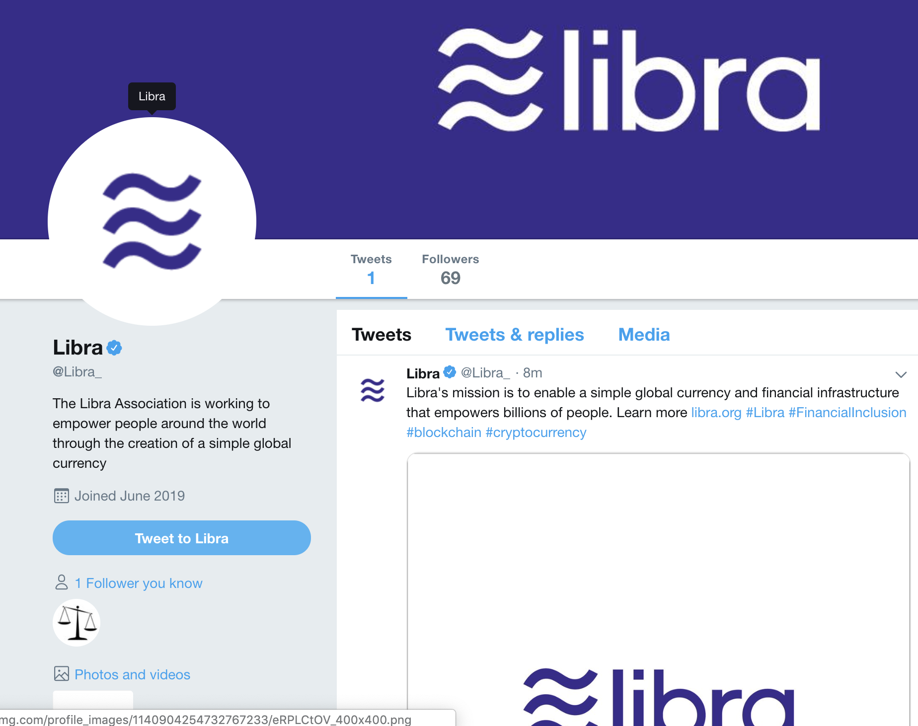 리브라 트위터 런칭 (페이스북 코인)byubat (66)in #tuza • 7 years ago https://twitter.com/Libra_?lang=en 69번째 ㅋㅋㅋ 팔로워 입니다. 뭔가 빠르게 찾아낸것 같아 ㅎ 흐뭇하네요. 시장에 얼마나 파급력을 줄지! #kr #sct