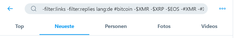 -filter:links -filter:replies lang:de #bitcoin -$XMR -$XRP -$EOS -#XMR -#XRP -#EOS