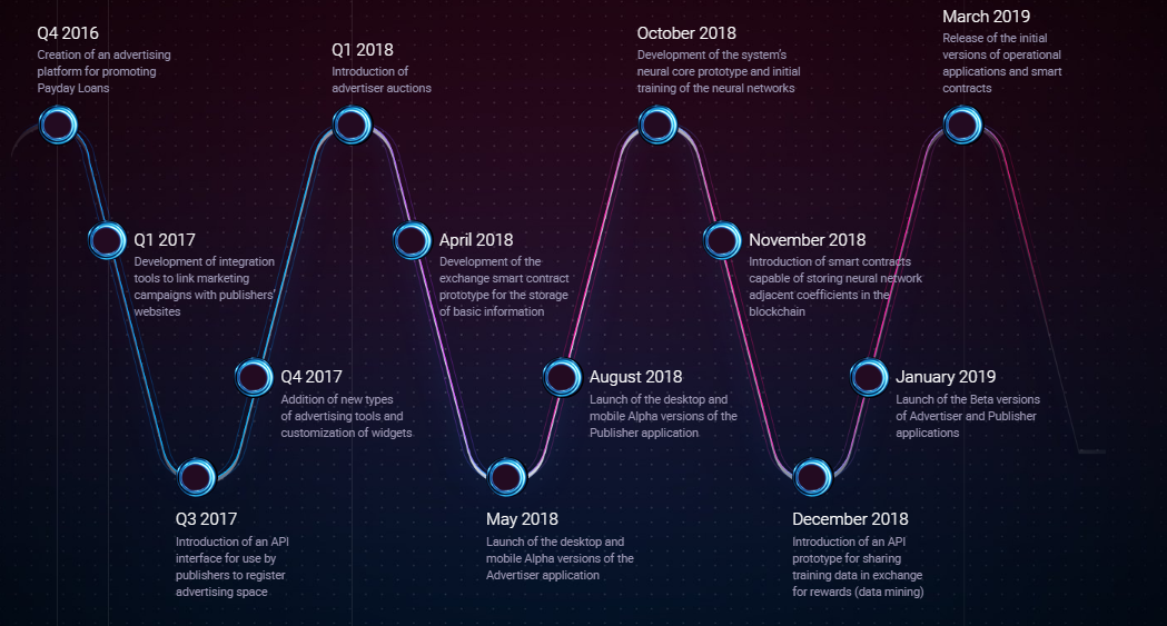 Track each target action and store the results in a database transparent for all participants. Create trusted reputation ratings used by the neural core for advertisers and publishers. Create mechanisms for guaranteeing mutual settlements (ESCROW, crypto factoring). Tokenize ad spaces for publishers and pay in advance in UBEX Tokens. Realize distributed data mining for consumer-related information used by the neural core.