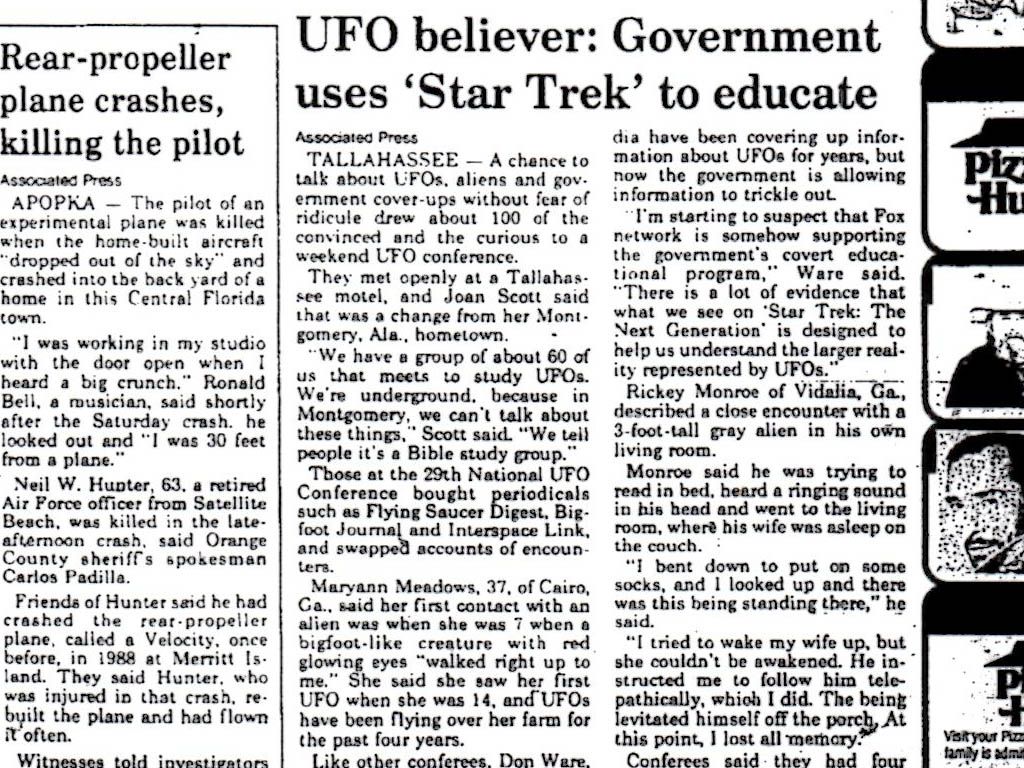 Below I am including printouts of microfilm. These are from the original listing of the Specific Star Trek: The Next Generation episode I am referencing. And I also have an article ran by the Associated Press in the back of the front page section of the Pensacola News Journal the very next day. These printed sections of the Pensacola News Journal's television schedule and subsequent article about how Star Trek: The Next Generation is being used by the "government's covert educational program" are eye-opening when you consider Associated Press and Project Mickingbird. As we know there are no coincidences in intelligence operations. And as this article came out the very next day after this disturbing Star Trek: The Next Generation episode, we can conclude that UFO disclosure has been with us for a long time.